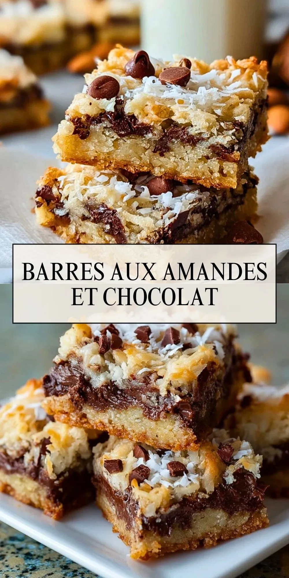 C’est la combinaison parfaite de saveurs et de textures qui rend ces barres si appréciées : la base légèrement croustillante aux amandes, la douceur du chocolat fondant et le contraste de la noix de coco. Chacune apporte un équilibre : l’amande pour l’énergie, le chocolat pour le plaisir, la noix de coco pour l’originalité.