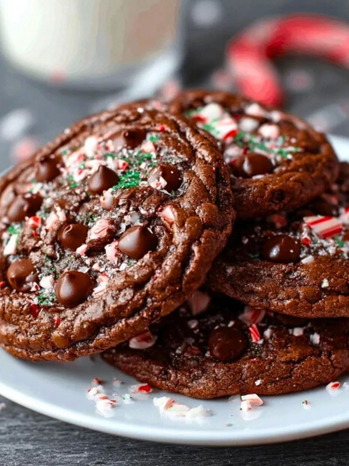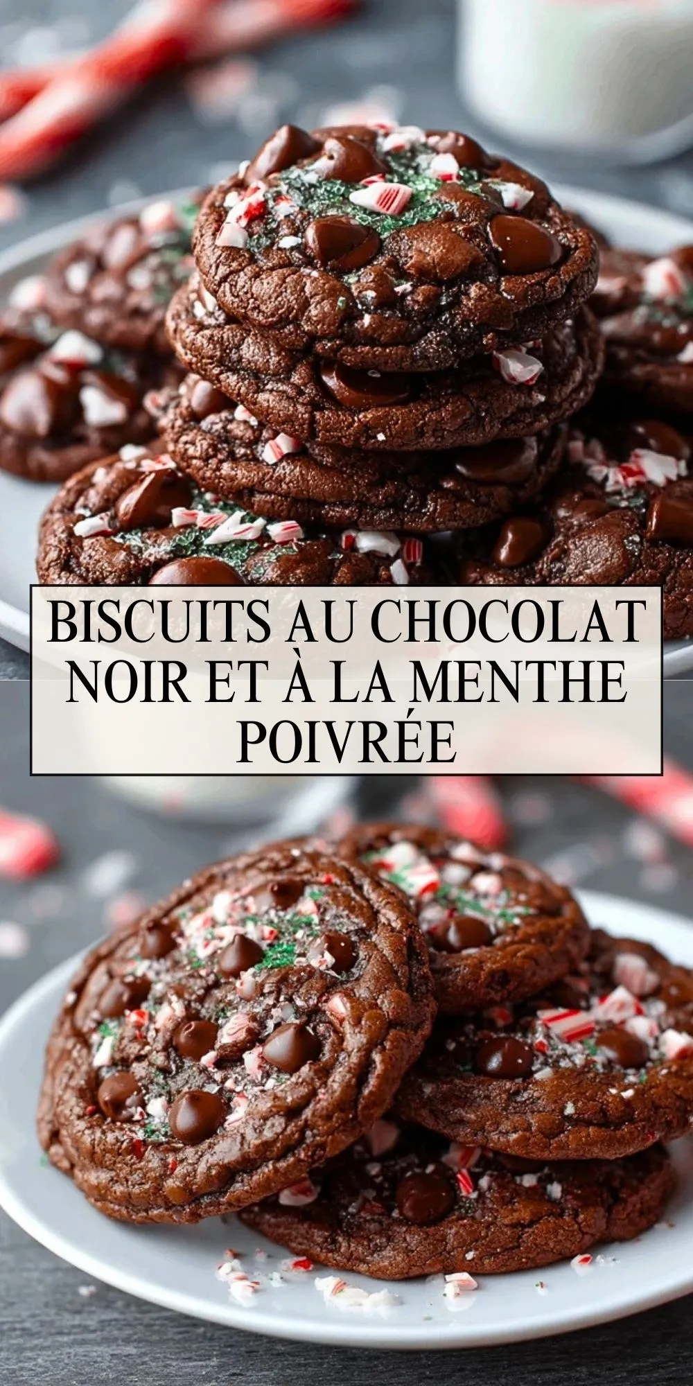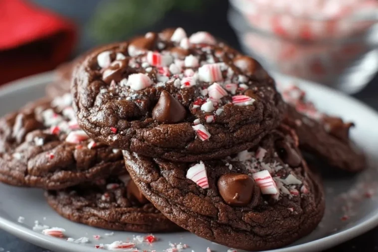 Des cookies moelleux et fondants, intensément chocolatés, relevés d’une touche de menthe poivrée et décorés d’éclats de bonbons pour un croquant festif. Parfaits pour les fêtes ou un goûter hivernal réconfortant.
