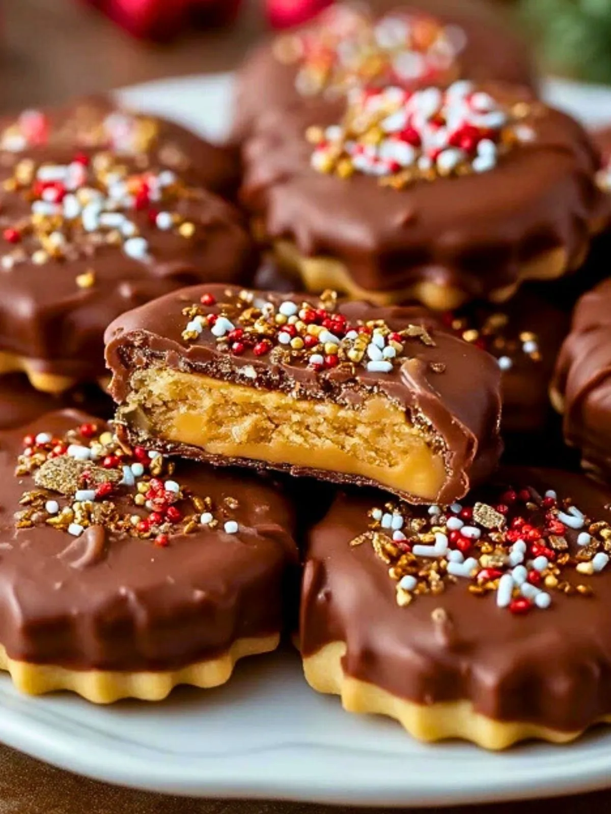 - Petits sablés fourrés au caramel beurre salé et trempés dans le chocolat.