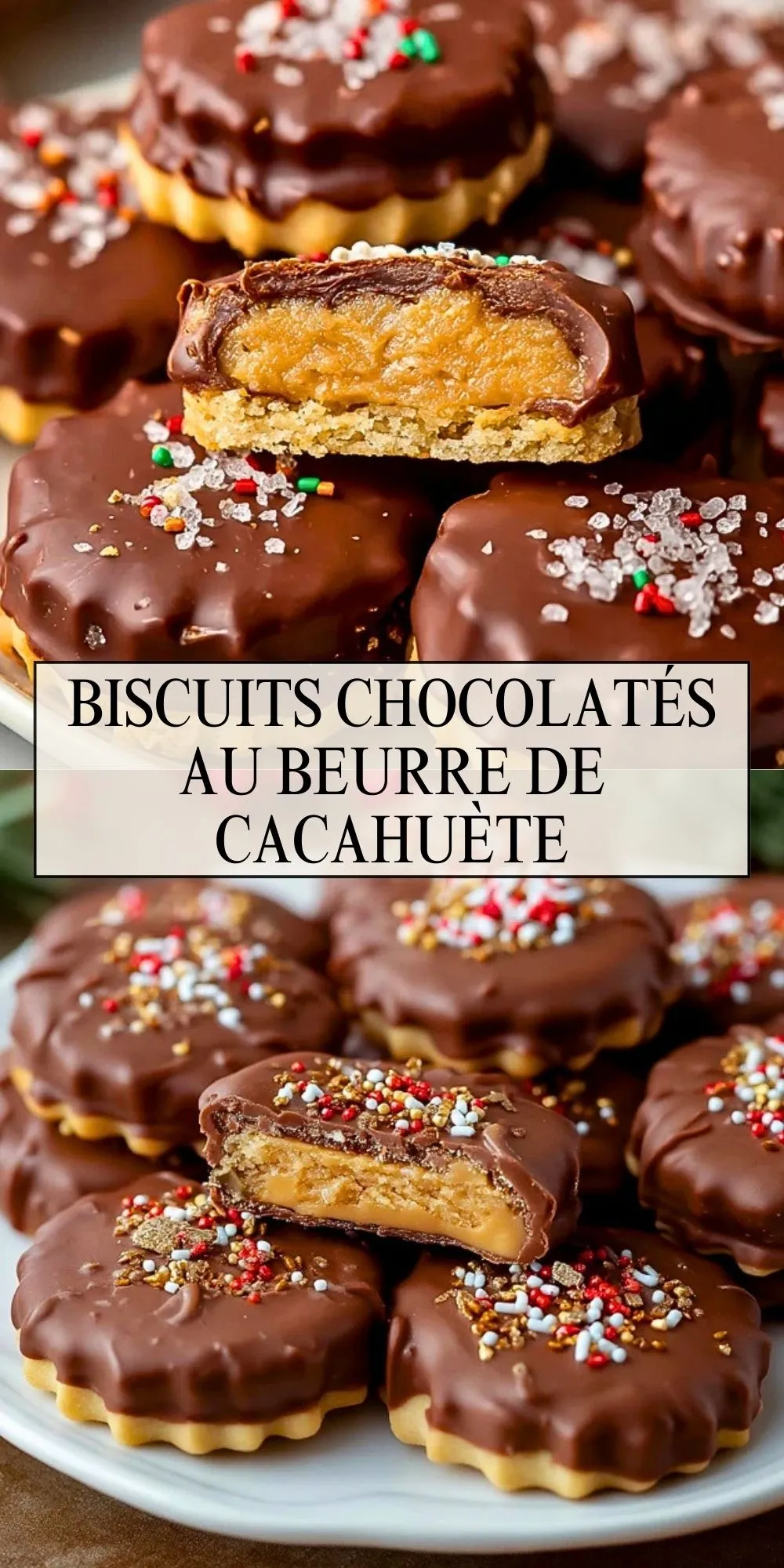 Ces biscuits chocolatés au beurre de cacahuète sont composés d’un sablé fondant garni d’une couche généreuse de beurre de cacahuète, le tout enrobé de chocolat croquant et saupoudré de miettes de biscuit et d’une touche de sel, parfaits pour une gourmandise riche et réconfortante.