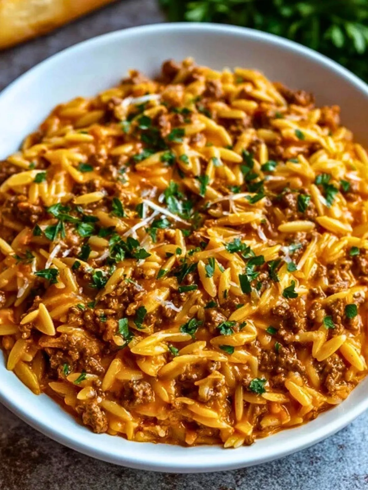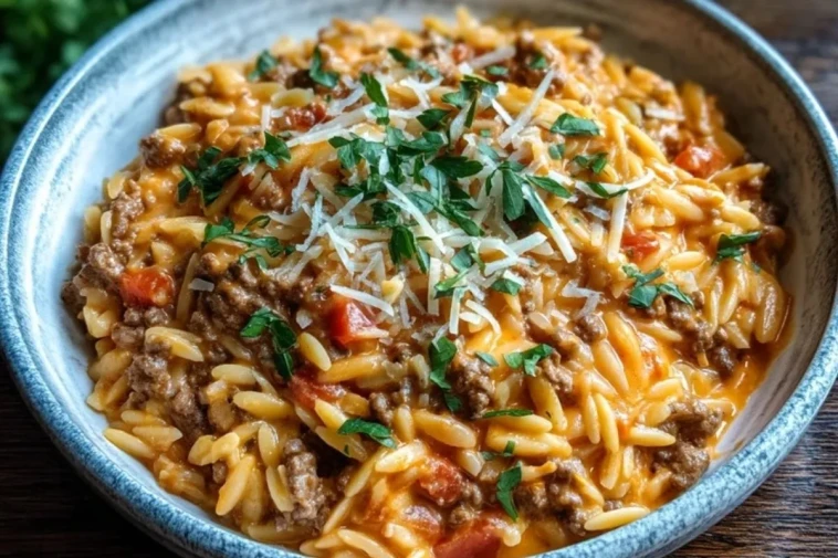 Le mariage entre les petites pâtes orzo et la viande en sauce crée une texture riche et crémeuse, tout en restant facile à préparer avec des ingrédients accessibles. Ce plat unique, généreusement garni de parmesan râpé et de persil frais, plaira à toute la famille.