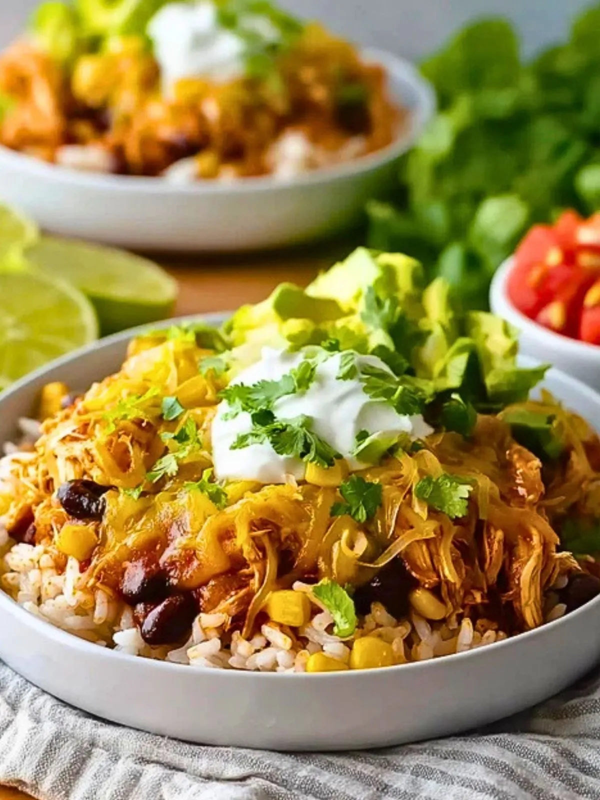 Répartissez le riz dans des bols de service. Disposez ensuite le poulet effiloché chaud, les haricots noirs, le maïs, les tomates cerises et les lamelles d’avocat en zones distinctes pour un rendu généreux et appétissant. Ajoutez un peu de cheddar râpé sur le dessus.