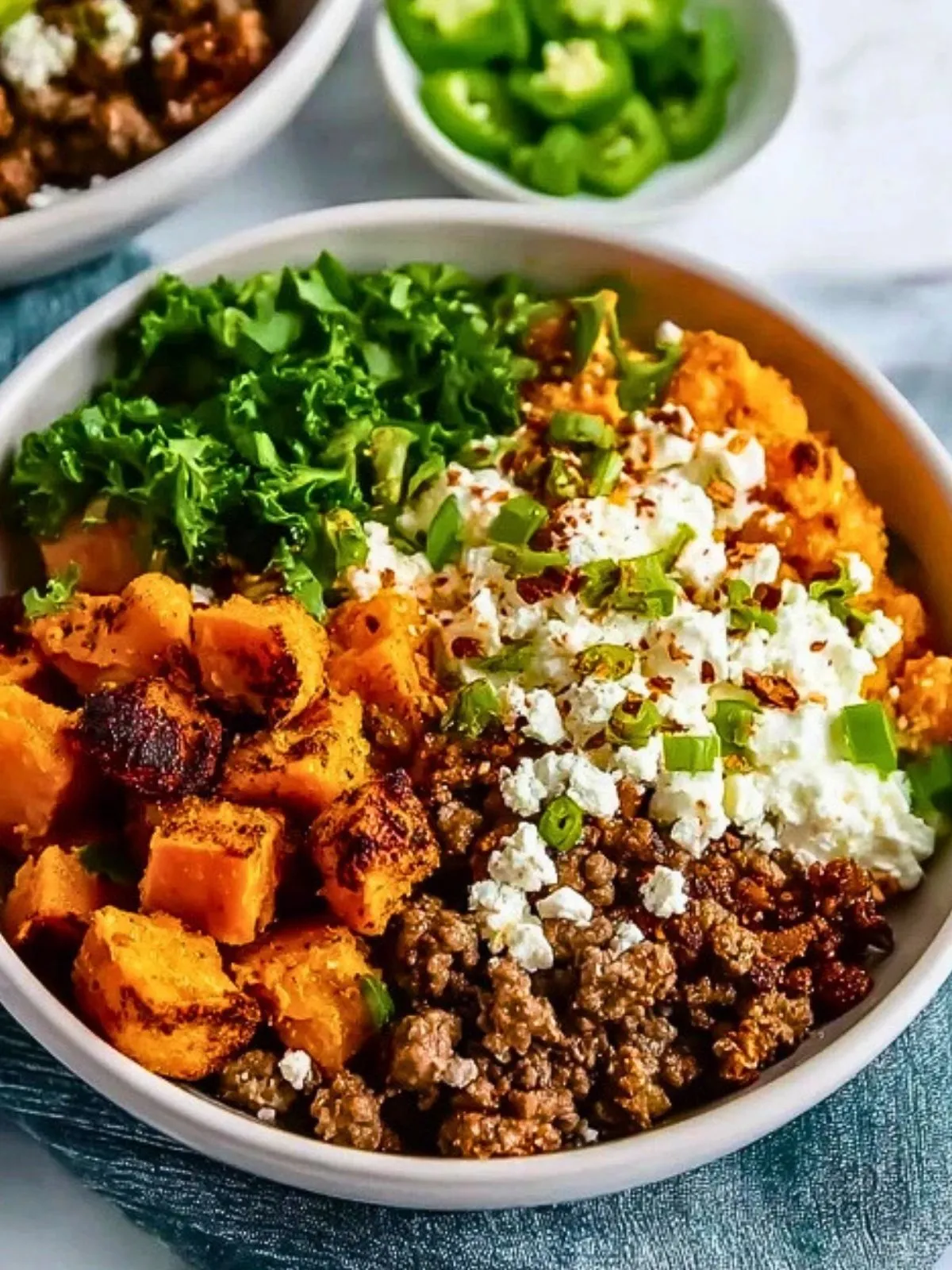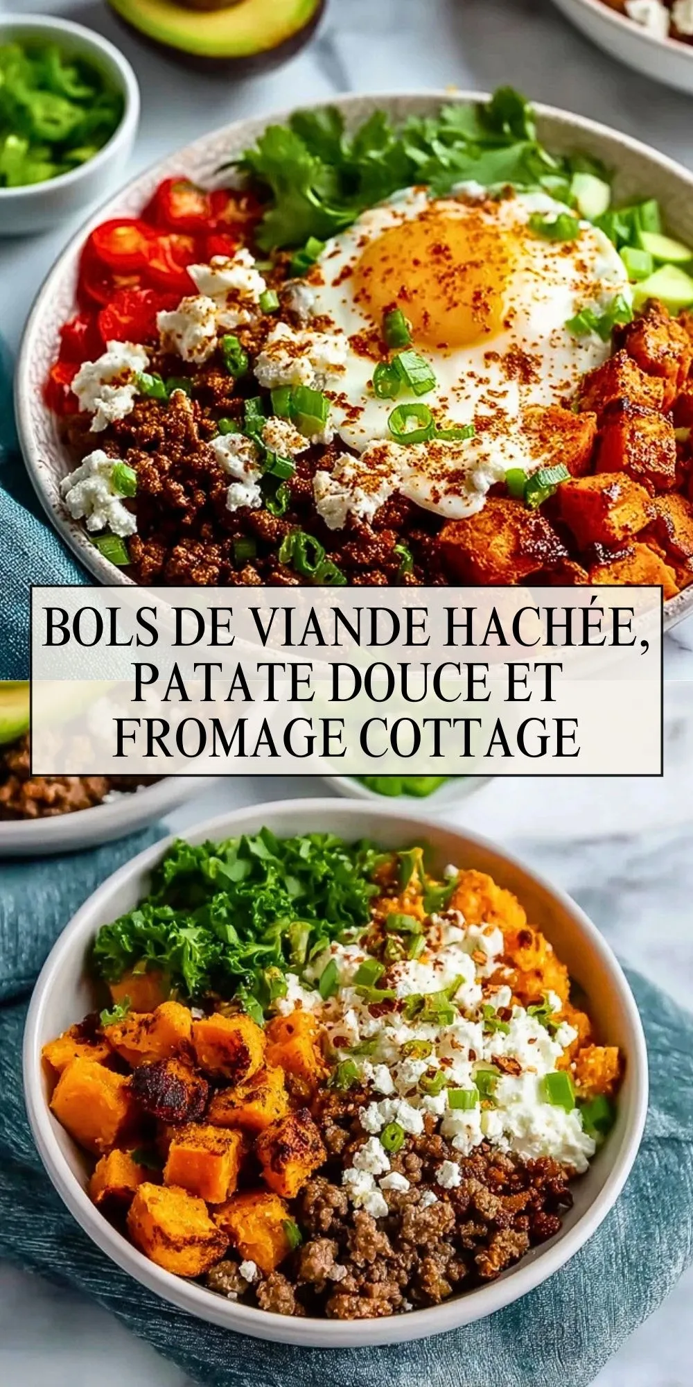 Avec leurs couleurs vibrantes et leurs textures contrastées, ces bols offrent un équilibre entre le fondant des patates douces rôties, la richesse de la viande hachée et la douceur du fromage cottage. C’est une recette moderne, inspirée des « bowl meals », parfaite pour le batch cooking ou les repas rapides en semaine.