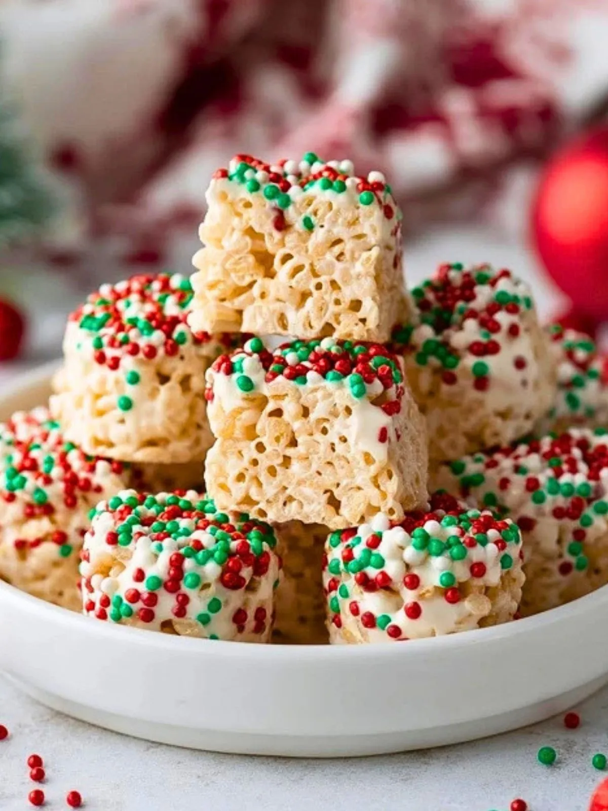 Ces bouchées de riz soufflé de Noël avec paillettes sont des petites douceurs festives, croustillantes et moelleuses à la fois, préparées avec des céréales de riz soufflé, des guimauves fondantes et une finition blanche décorée de perles rouges, vertes et blanches. Faciles à réaliser et parfaites pour les fêtes, elles apportent une touche joyeuse à un buffet, un goûter ou un assortiment de desserts de Noël.