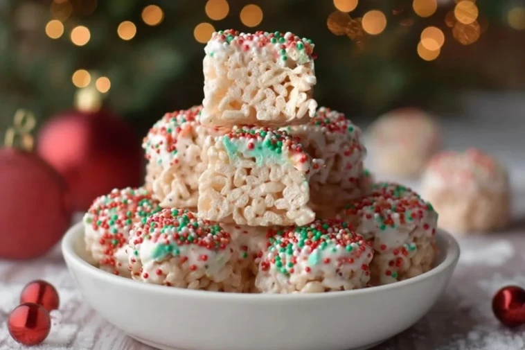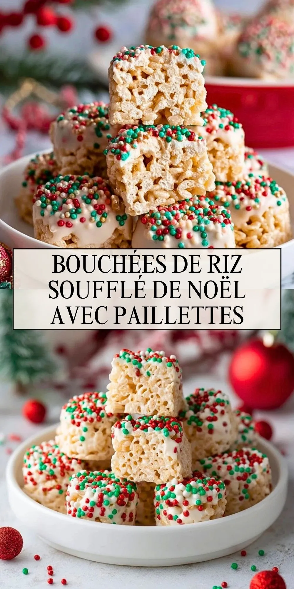 Ces bouchées de riz soufflé de Noël avec paillettes sont le genre de petite douceur festive qui disparaît en quelques minutes sur une table de fête. Elles réunissent tout ce qu’on aime en décembre : une texture légère et croustillante, une note fondante de guimauve, une finition sucrée et un décor rouge, vert et blanc qui rappelle instantanément l’ambiance des fêtes.