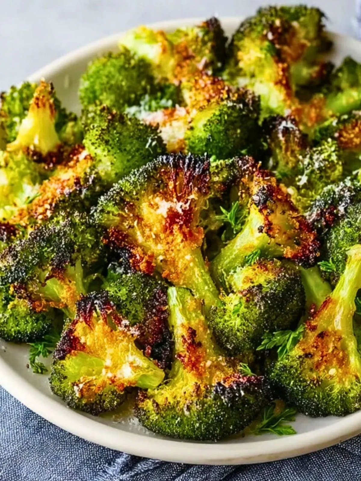 Transférez le brocoli croustillant dans un plat, parsemez de parmesan râpé si désiré, et servez immédiatement en accompagnement ou en apéritif sain.