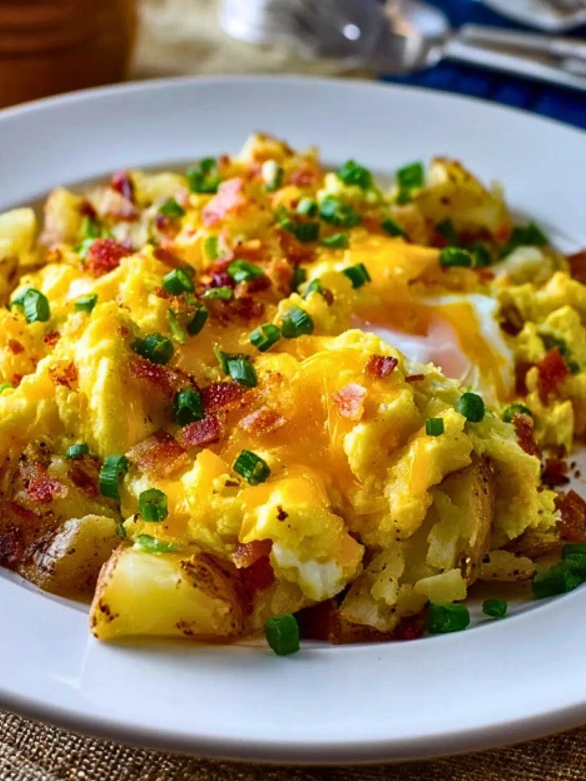 Cette brouillade de pommes de terre au fromage réunit des œufs moelleux, des dés de pomme de terre fondants et du bacon croustillant, le tout nappé de fromage bien gratiné pour un petit-déjeuner ou un brunch ultra réconfortant.