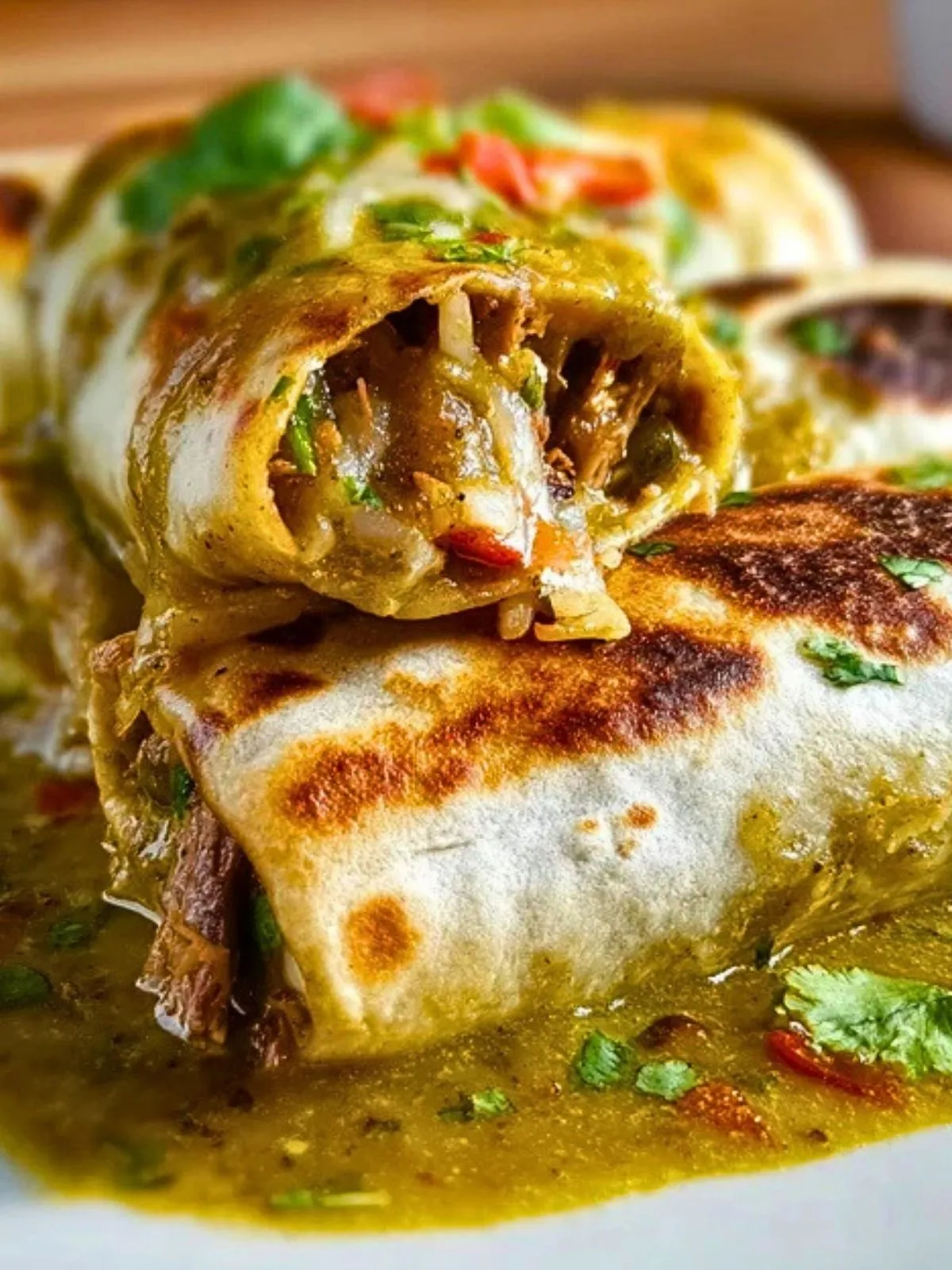 Keywords: burrito, chili verde, tex-mex, tortilla, viande mijotée