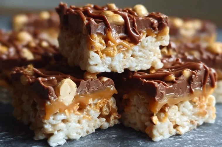 Carrés ultra-gourmands composés d’une base croustillante de riz soufflé et de guimauves, surmontée d’une couche de caramel au beurre salé, de cacahuètes croquantes et d’un nappage généreux de chocolat au lait. Parfaits pour un goûter, un dessert à partager ou un buffet festif !