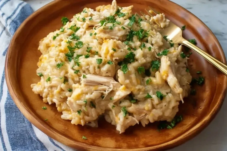 La casserole de poulet et riz à la mijoteuse est le type de plat réconfortant que l’on aime préparer quand on veut quelque chose de simple, généreux et sans complication. Le poulet devient tendre au fil de la cuisson lente, le riz absorbe les saveurs du bouillon et de la sauce, et l’ensemble se transforme en un repas crémeux qui évoque immédiatement la cuisine familiale.