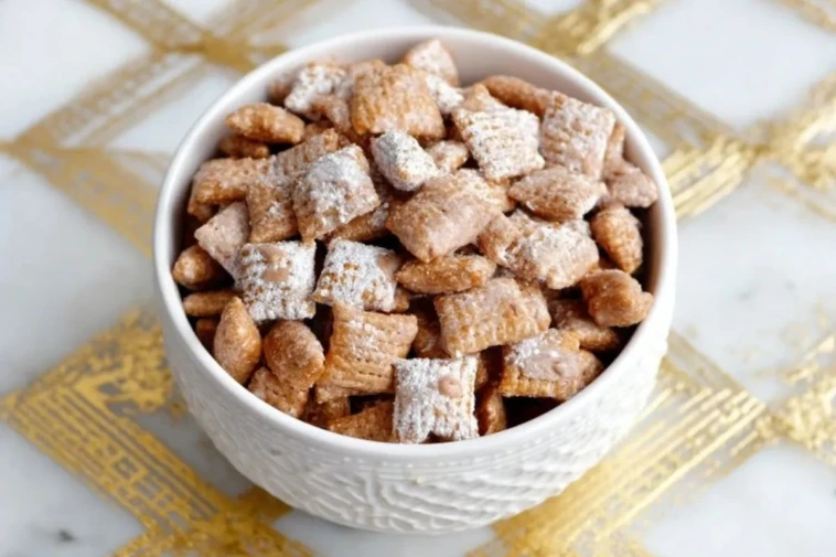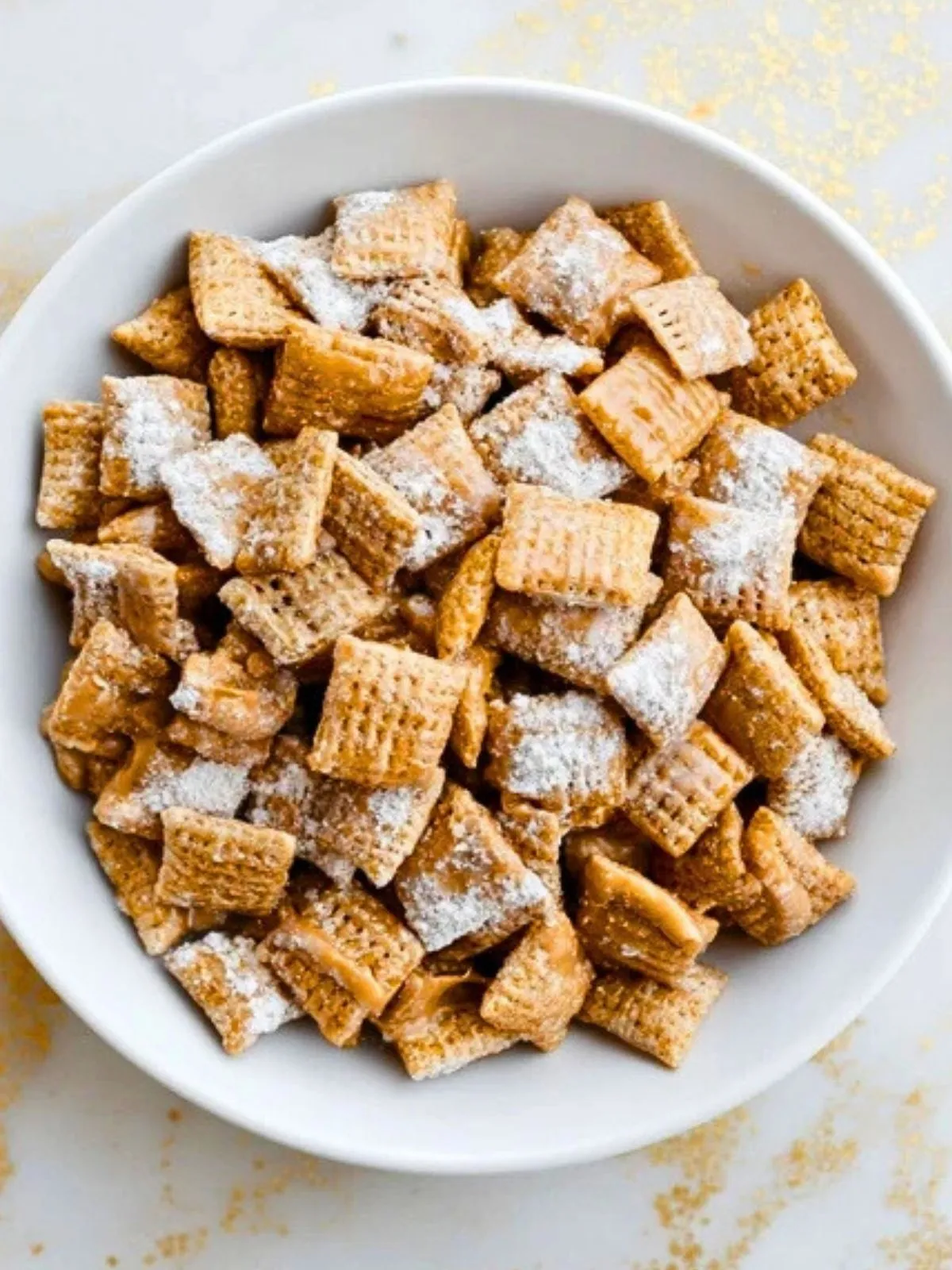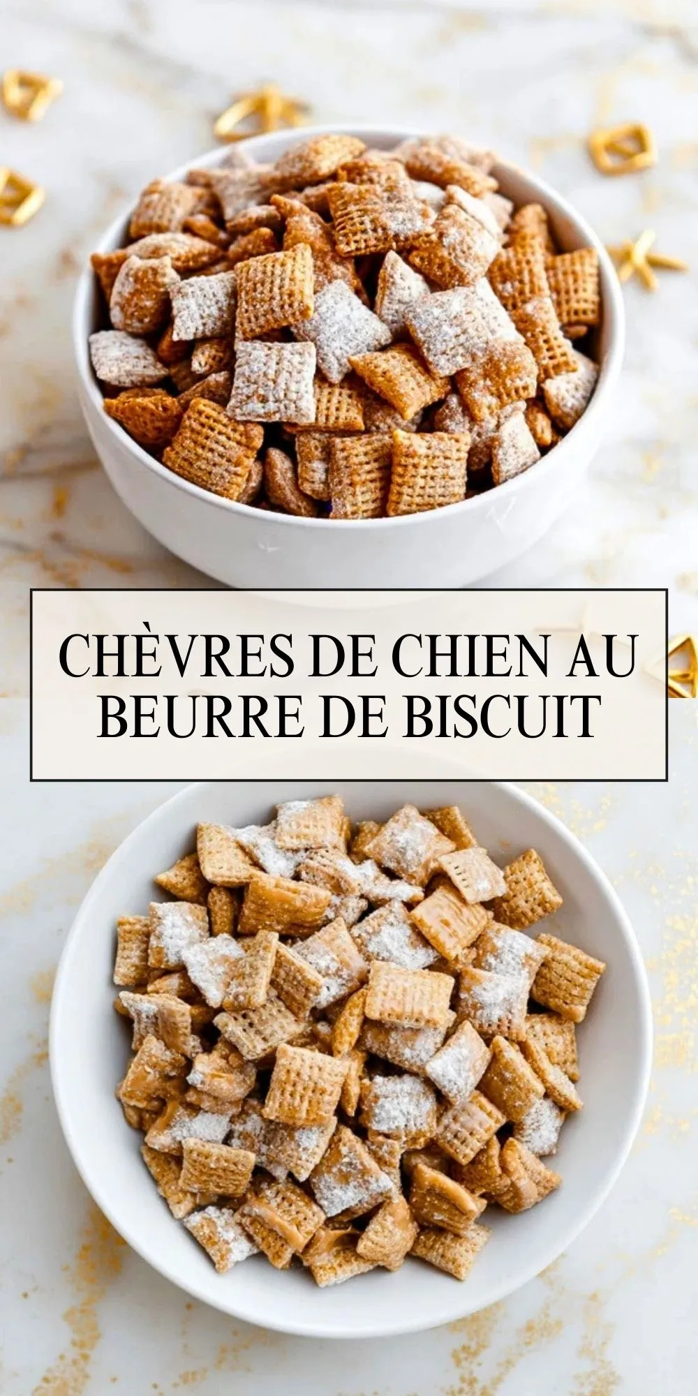 Les chèvres de chien au beurre de biscuit (version française des « puppy chow » ou « muddy buddies » américains) sont de petits carrés croustillants de céréales enrobés d’un mélange fondant de chocolat et de pâte de spéculoos, puis roulés dans le sucre glace. Un snack express, ultra-gourmand, sans cuisson et parfait pour le partage !