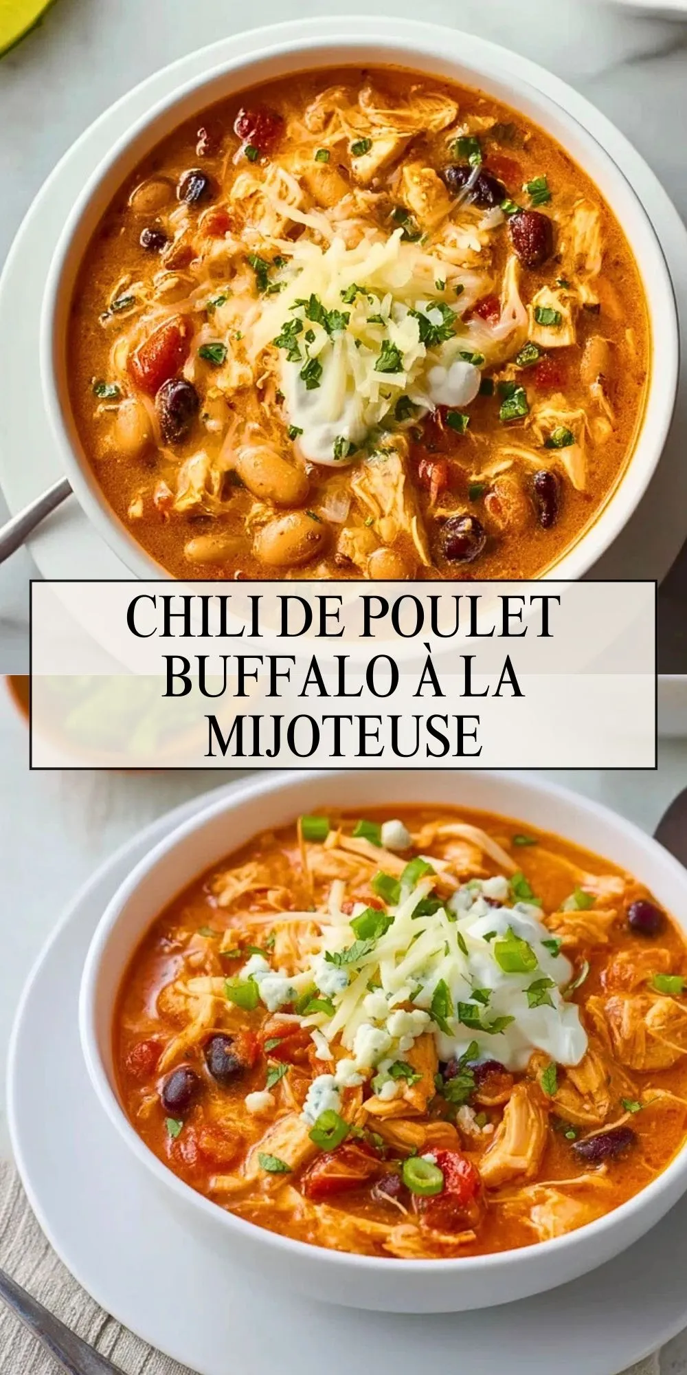 Le chili de poulet buffalo à la mijoteuse est un plat chaleureux qui combine le côté réconfortant d’un chili généreux avec la personnalité relevée de la célèbre sauce buffalo. Entre le poulet tendre, les haricots fondants, les tomates mijotées et la touche crémeuse apportée en fin de cuisson, on obtient un repas complet, parfumé et particulièrement agréable à partager.