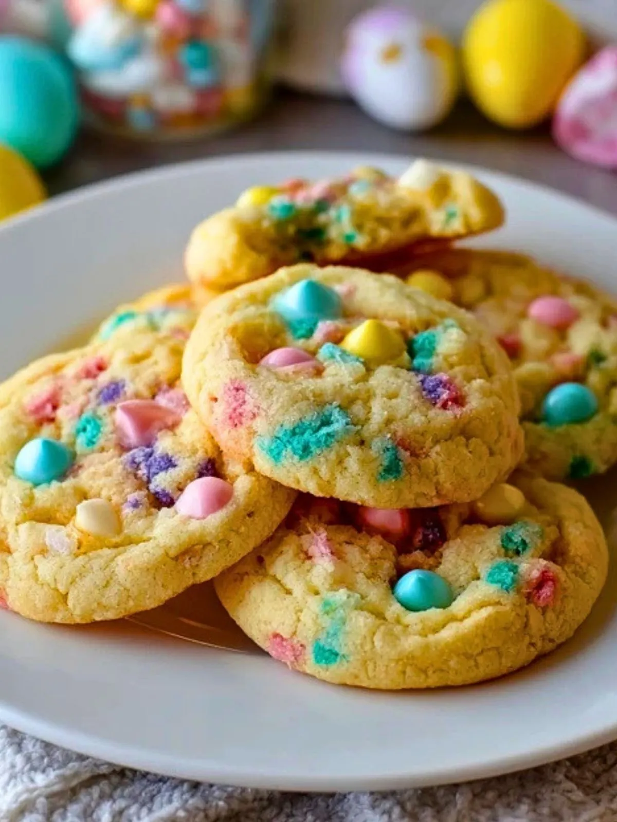 Ces cookies de Pâques aux couleurs vives apportent immédiatement une note joyeuse à la table. Leur texture est tendre au centre, légèrement dorée sur les bords, avec de jolies touches pastel qui rappellent les œufs en sucre et les fêtes de printemps. Ils séduisent autant par leur apparence que par leur goût délicat de biscuit au beurre.
