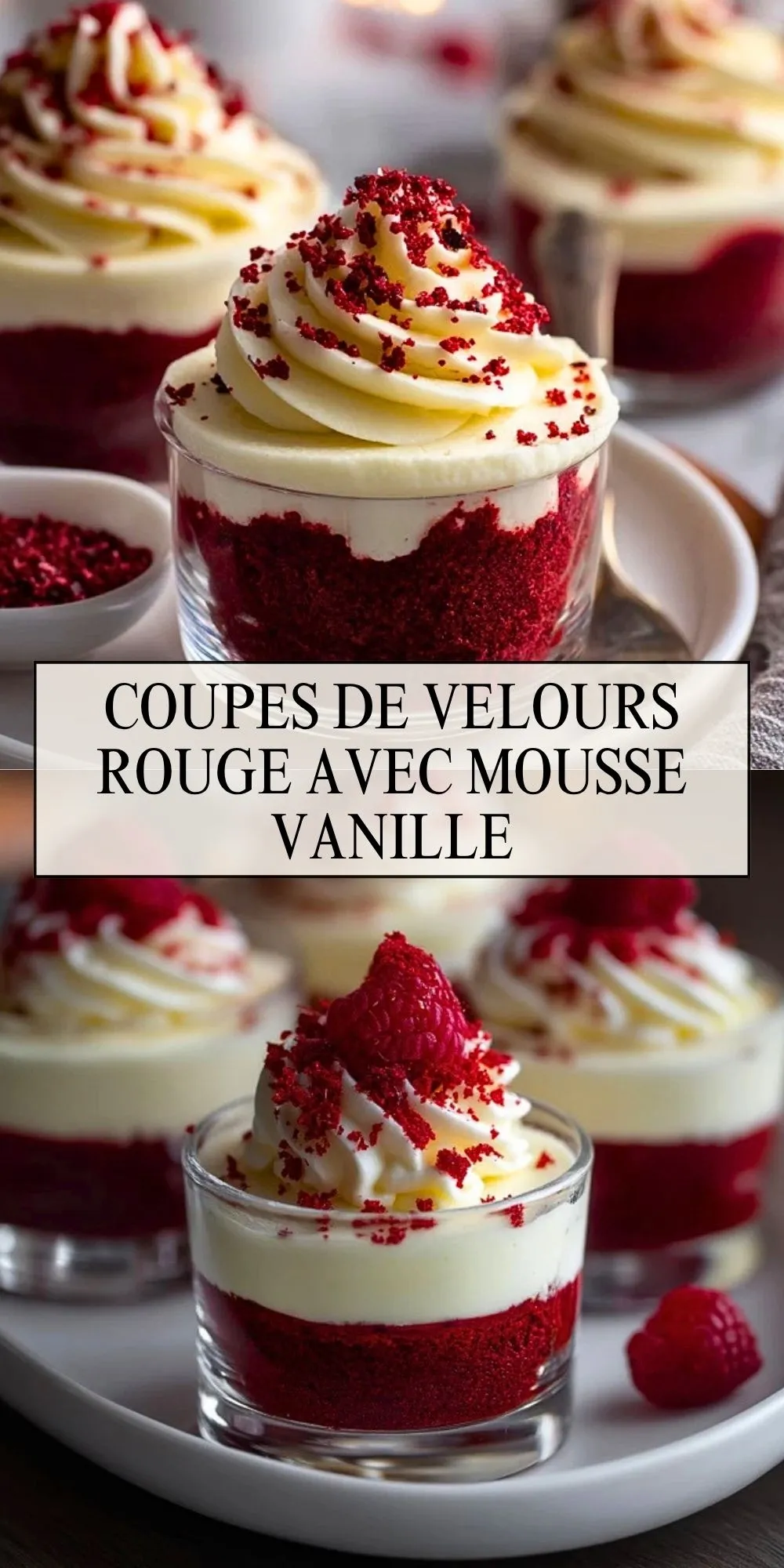 Keywords: coupes de velours rouge, mousse vanille, dessert en verrines, red velvet, framboises