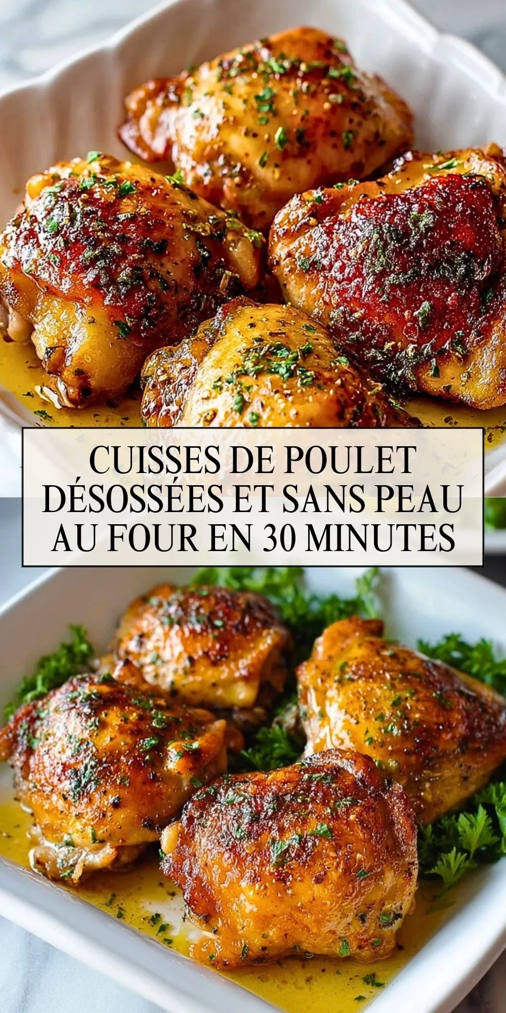 Voici une recette irrésistible et rapide : les cuisses de poulet désossées et sans peau au four, prêtes en seulement 30 minutes ! Cette préparation allie la tendreté du poulet à une sauce légèrement citronnée et herbacée, le tout avec une cuisson express au four. Parfaite pour les soirs de semaine pressés ou un repas convivial, cette recette ravit petits et grands avec sa peau dorée (même sans la peau, le dessus caramélise grâce à la sauce !) et ses saveurs méditerranéennes.
