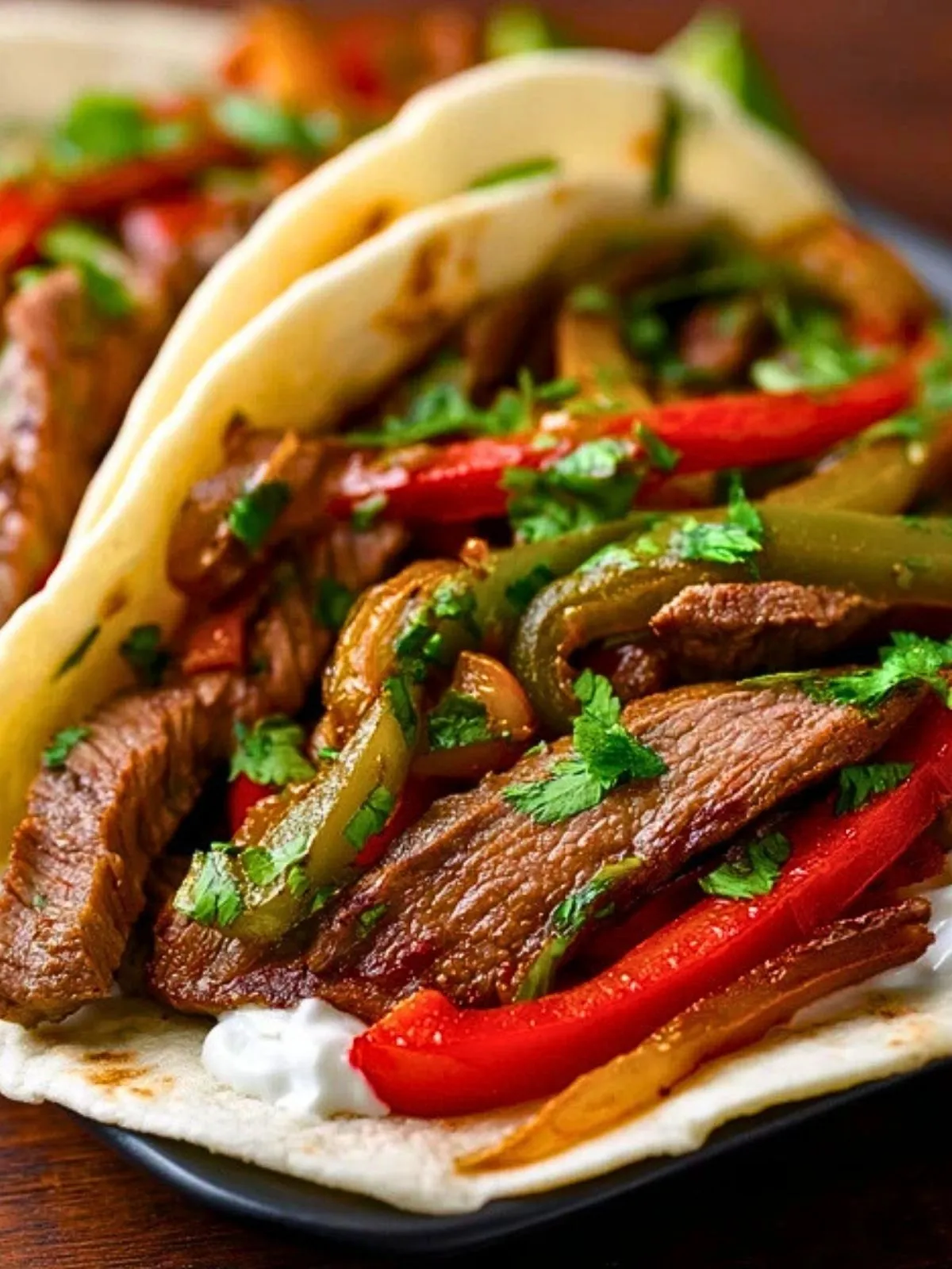 Des lamelles de bœuf bien grillées, des poivrons fondants et colorés, des oignons légèrement caramélisés, le tout roulé dans une tortilla chaude avec une touche de crème et de coriandre… ces fajitas de bœuf sont le genre de plat convivial qui se mange avec les doigts et fait parler tout le monde autour de la table.