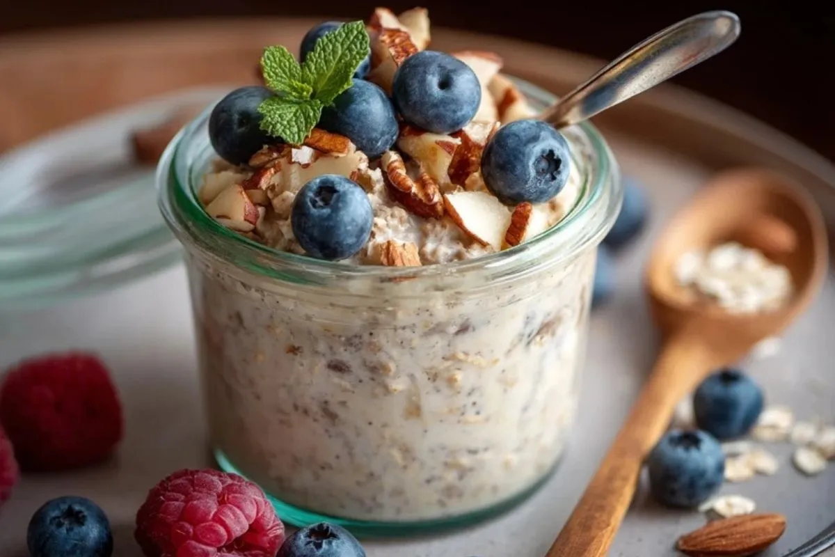 Cette version rapide s’inspire des célèbres overnight oats, mais sans obligation de les laisser toute une nuit. En quelques minutes, les flocons s’imbibent de lait et de yaourt, les graines gonflent, et vous obtenez une texture onctueuse que vous pouvez déguster tout de suite ou emporter avec vous.