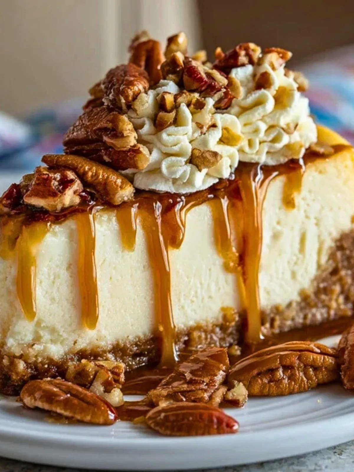 Un gâteau au fromage blanc ultra onctueux, délicatement parfumé au beurre noisette, posé sur une base biscuitée croustillante et garni de noix de pécan croquantes nappées de caramel.