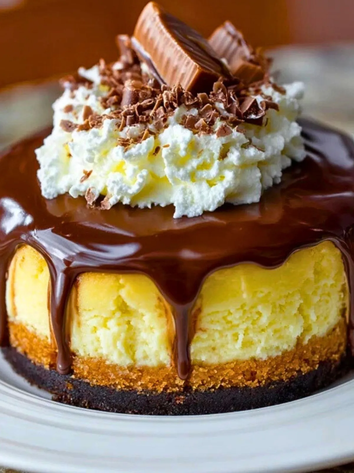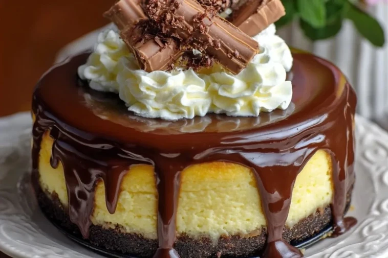 Démoulez le cheesecake bien froid et placez-le sur un plat de service. Versez la ganache sur le dessus en la laissant couler naturellement sur les bords. Terminez avec des rosaces de chantilly et quelques morceaux de barres chocolatées pour une présentation généreuse.