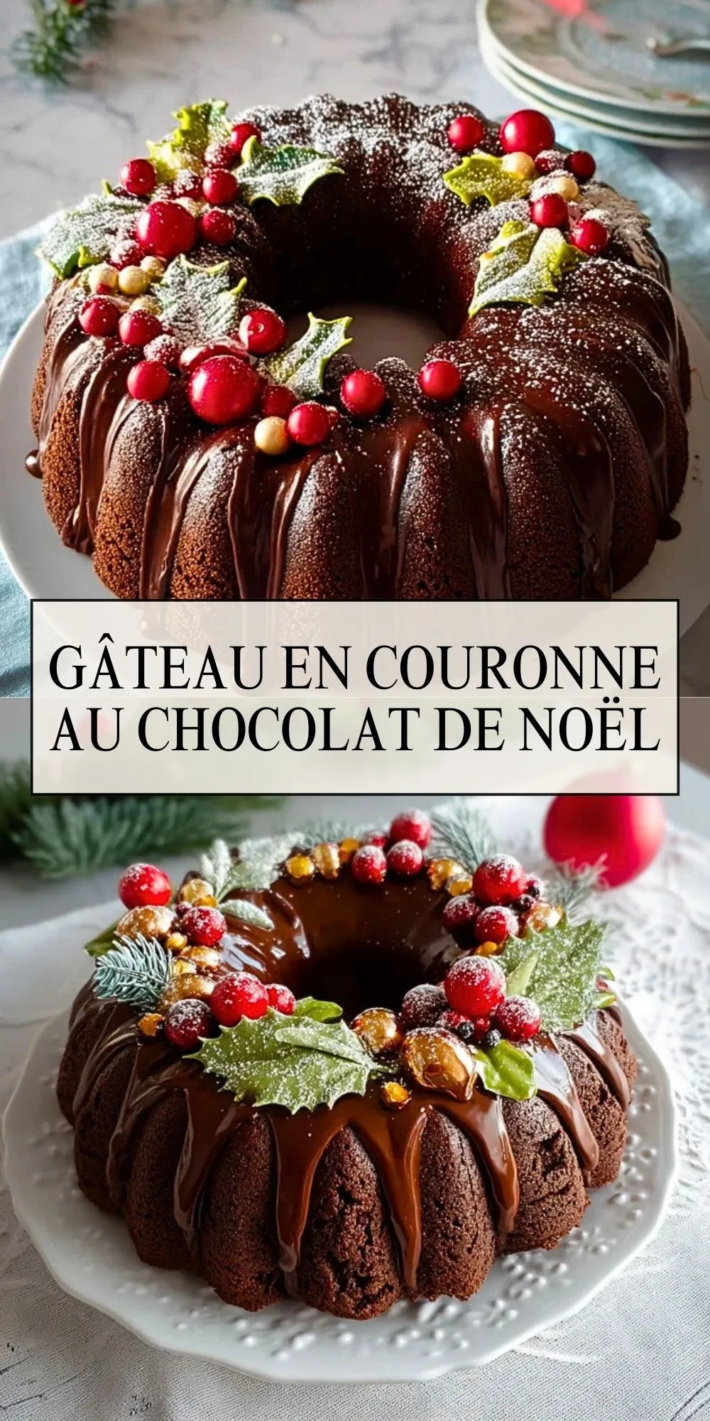 Ce gâteau en couronne au chocolat, moelleux et intensément parfumé, est le dessert festif par excellence pour Noël. Facile à réaliser et très décoratif, il séduit par son glaçage brillant et ses touches gourmandes de fête. Parfait pour régaler toute la famille autour de la table de réveillon.