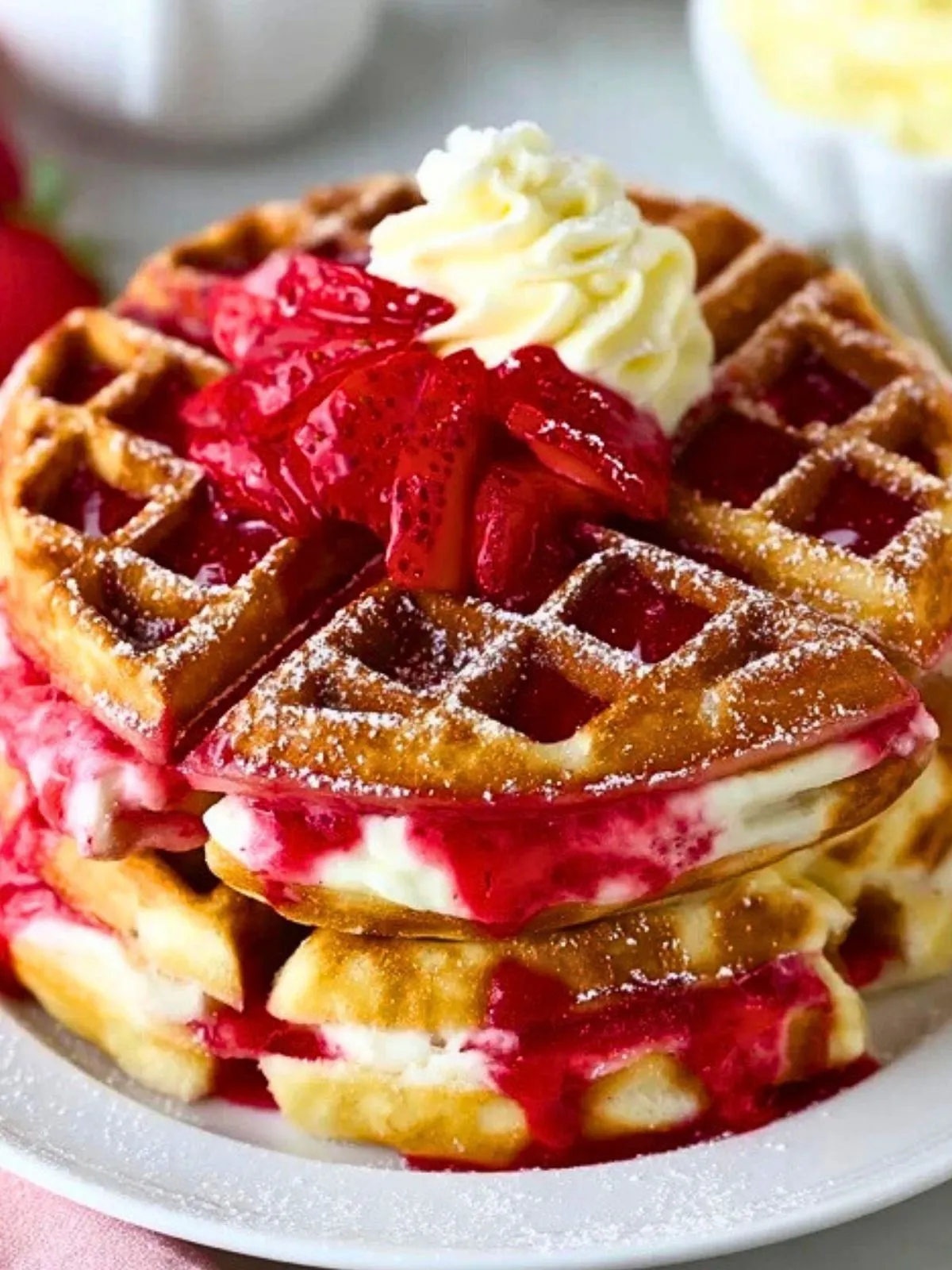 Les gaufres fourrées au fromage frais et aux fraises sont une gourmandise printanière qui allie le moelleux des gaufres maison à la fraîcheur d’un fourrage crémeux et fruité. À la fois élégantes et conviviales, ces gaufres sont idéales pour un brunch raffiné, un goûter festif ou même en dessert lors d’un repas familial.