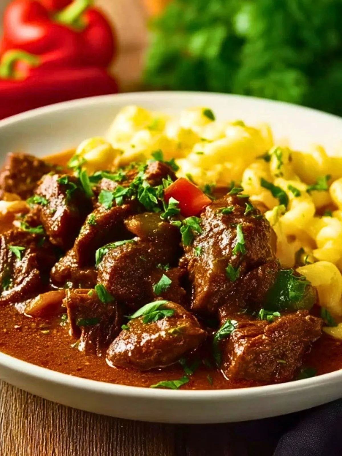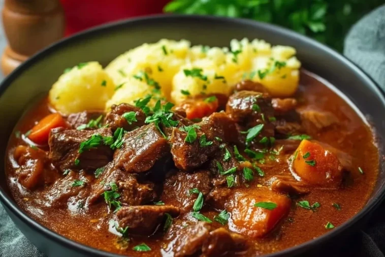 Un goulash allemand délicieux, mijoté lentement avec du bœuf tendre, des oignons fondants, des carottes et une sauce riche au paprika, est le genre de plat chaleureux qui rassemble tout le monde autour de la table. Servi avec des pommes de terre, des spaetzle ou une purée maison, il offre une assiette généreuse, rustique et pleine de saveurs profondes.