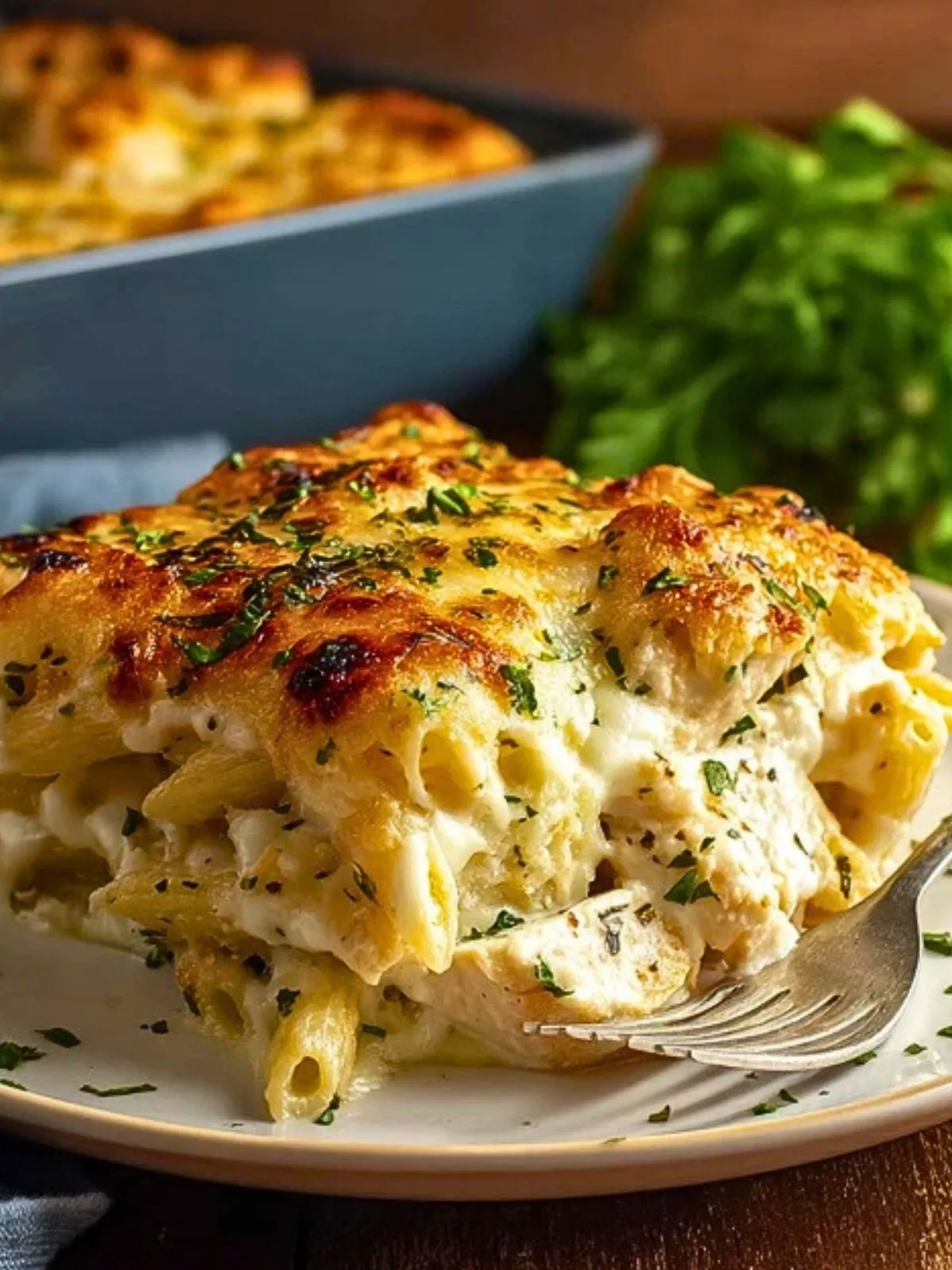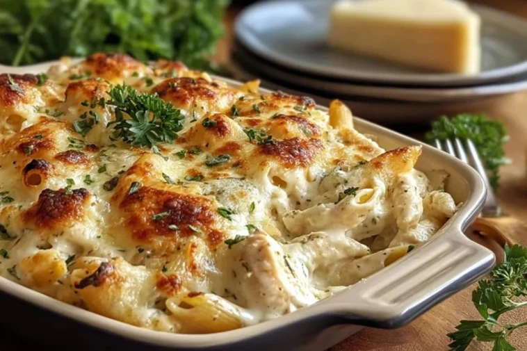 Gratin De Pâtes Au Poulet Alfredo Crémeux Avec Croûte De Mozzarella