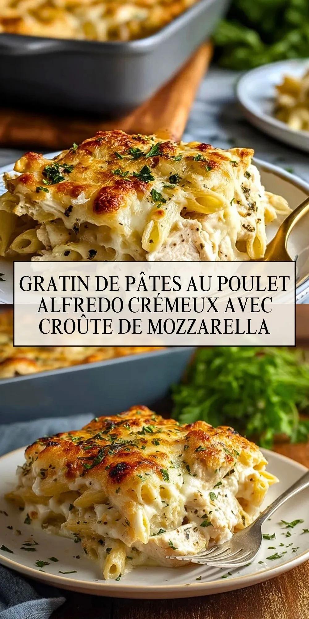Keywords: gratin pâtes poulet Alfredo mozzarella crémeux familial