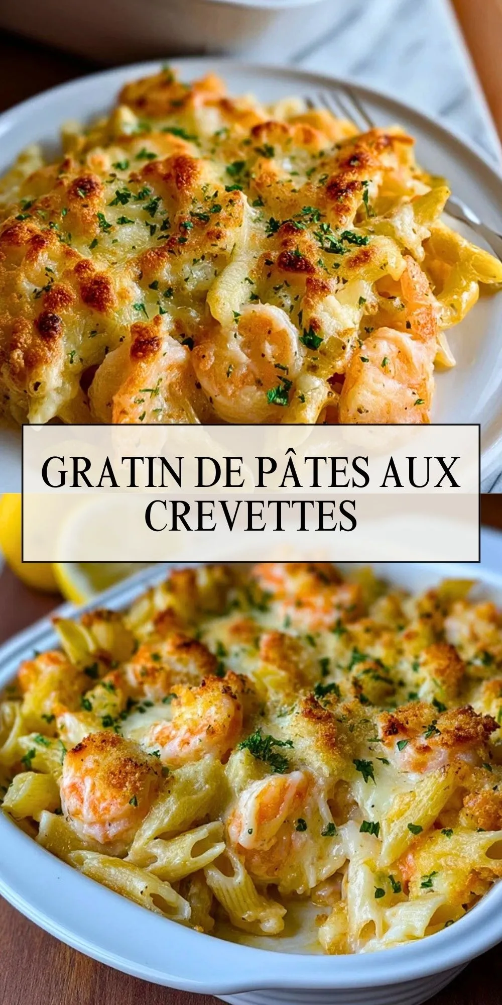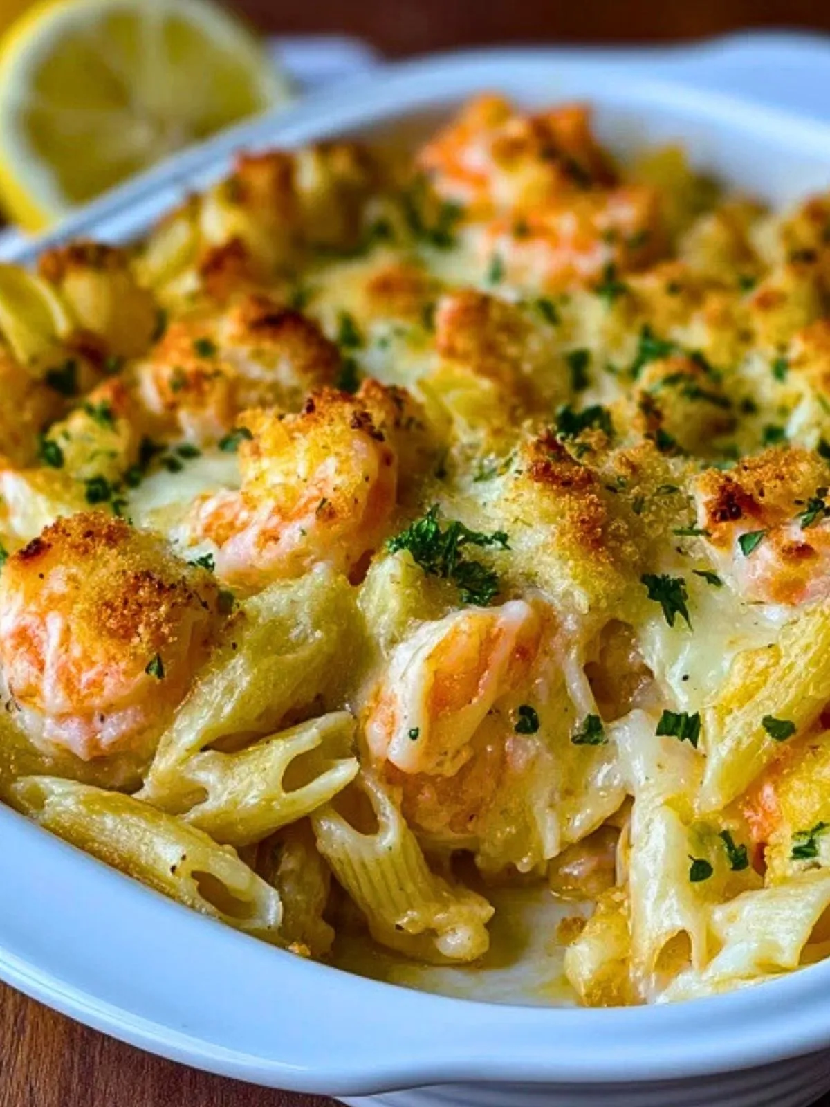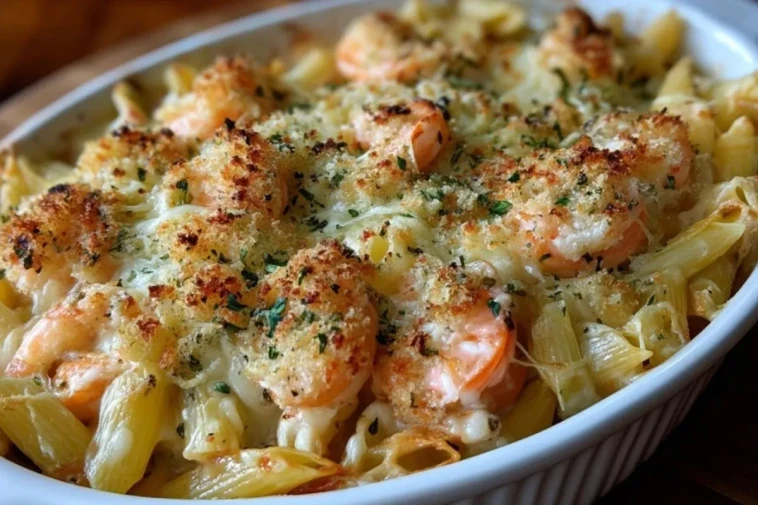 Ce gratin de pâtes aux crevettes est un plat crémeux et ultra réconfortant, où des pâtes al dente s’enrobent d’une sauce onctueuse à l’ail et au parmesan, garnies de crevettes fondantes et d’une croûte dorée et croustillante au fromage.