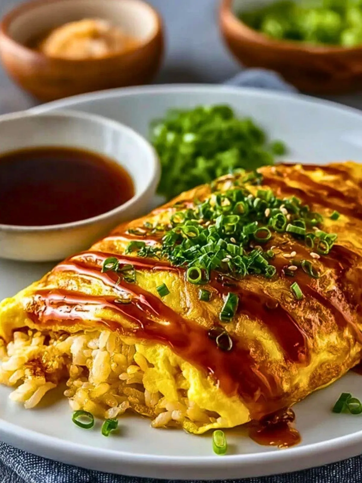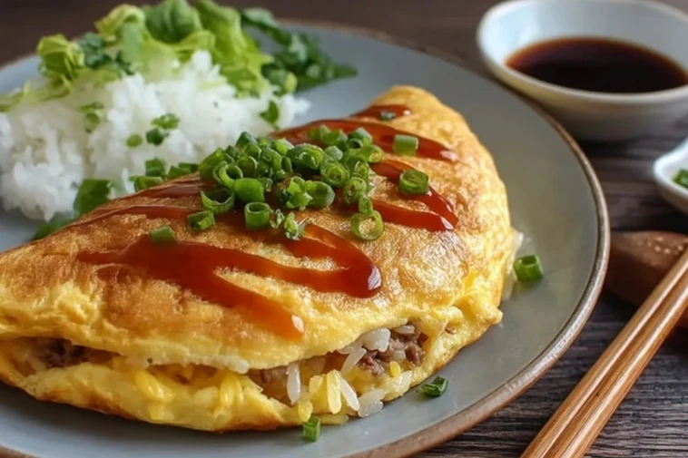 Une omelette moelleuse garnie de riz sauté parfumé, agrémentée de viande, légumes et sauce, puis roulée façon omurice japonaise. Facile à personnaliser, idéale pour un repas complet, rapide et familial.