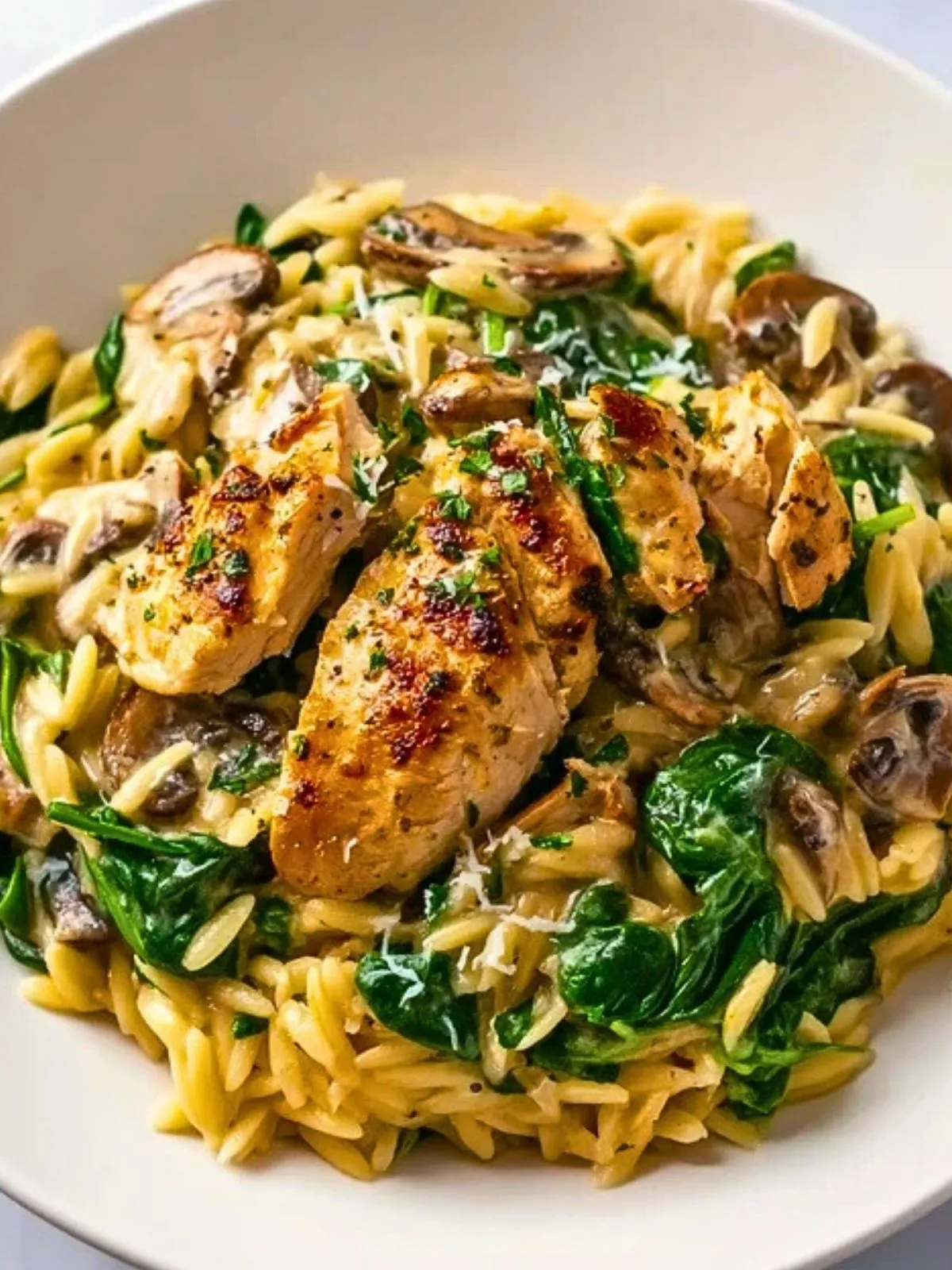 Orzo Crémeux aux Épinards, Champignons et Poulet