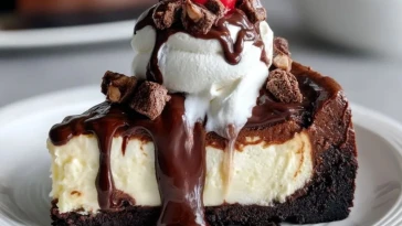 • Gâteau Au Fromage Blanc Avec Brownie Et Sauce Au Chocolat
