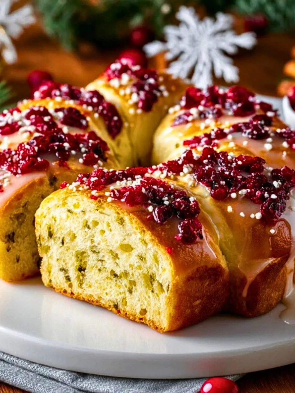 La douceur naturelle de la pâte se marie à merveille avec le croquant des canneberges séchées et le parfum intense de l’orange. Sa forme en couronne et sa garniture généreuse en font une pièce centrale aussi belle que gourmande, parfaite à partager lors des fêtes.