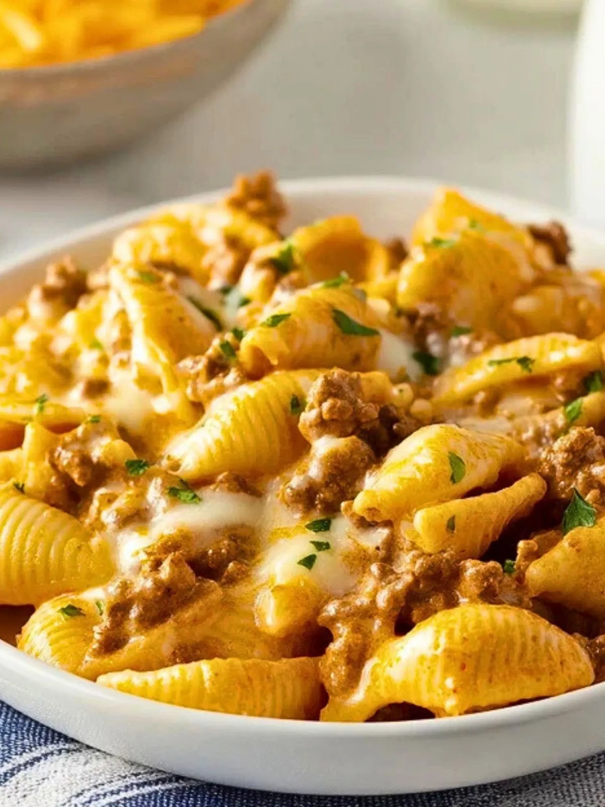 Des pâtes courtes gratinées avec une viande hachée savoureuse en sauce tomate, le tout nappé d’une sauce crémeuse aux fromages fondus. Un plat familial ultra-réconfortant, parfait pour les soirs de semaine ou les repas conviviaux.