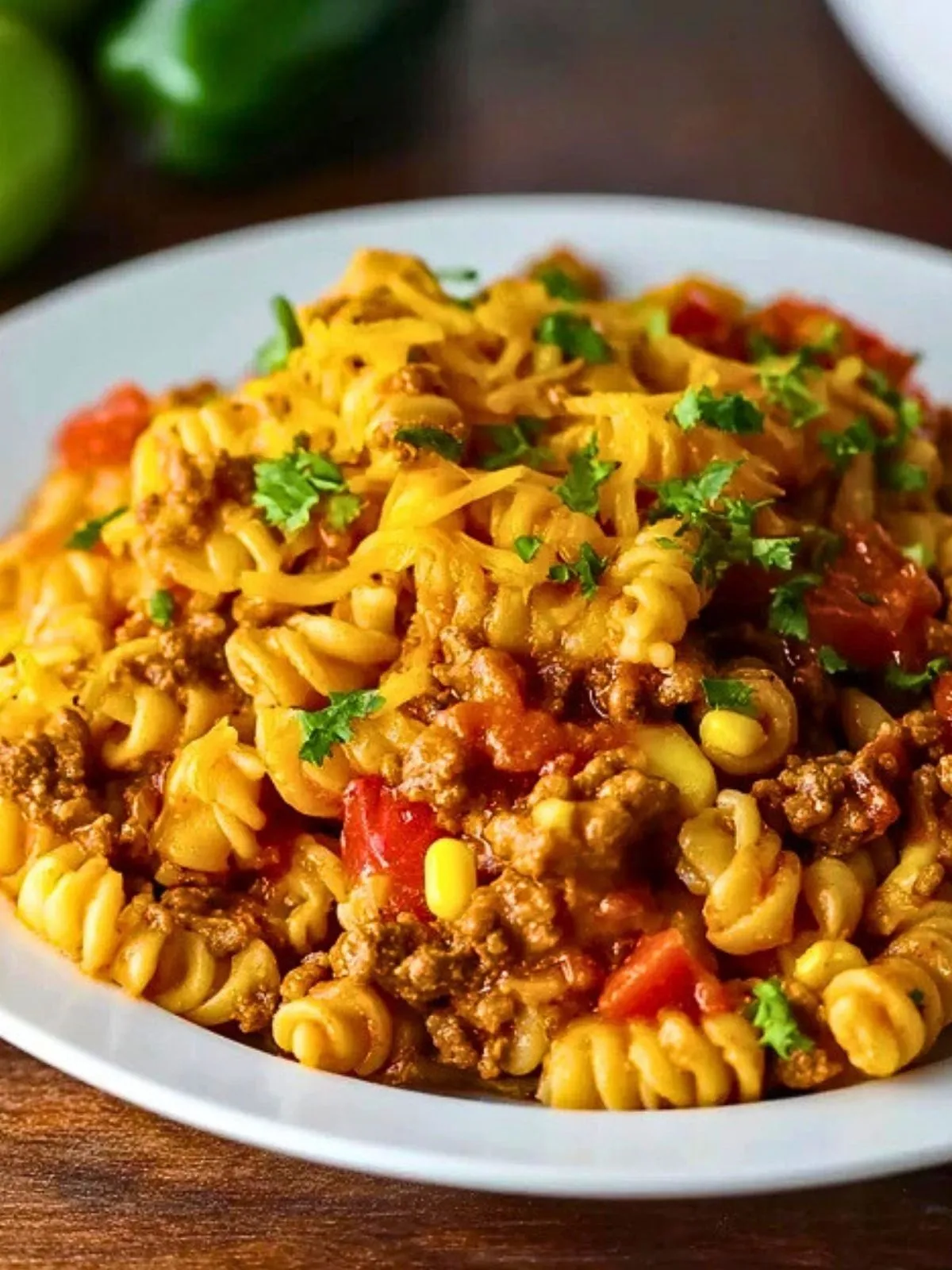 Servez ces pâtes taco bien chaudes, généreusement nappées de sauce et de fromage fondu. Elles se suffisent à elles-mêmes mais peuvent être accompagnées d’une salade verte croquante ou de légumes crus (tomates cerises, bâtonnets de concombre, poivrons) pour apporter de la fraîcheur. Un peu de lime, de jalapeños et de crème supplémentaire permettra à chacun de personnaliser son bol.