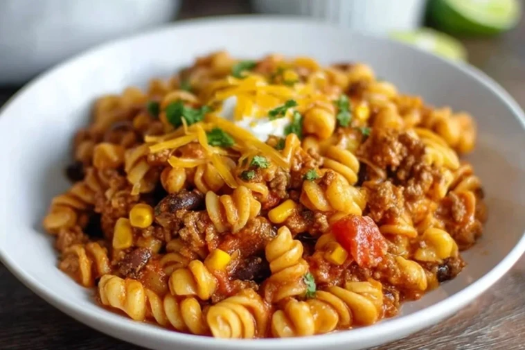 Ces pâtes taco rapides à la mijoteuse réunissent bœuf haché, sauce tomate épicée, maïs, haricots rouges et fromage fondant dans un seul plat de pâtes généreux et ultra réconfortant, préparé presque sans effort directement dans la cuve.