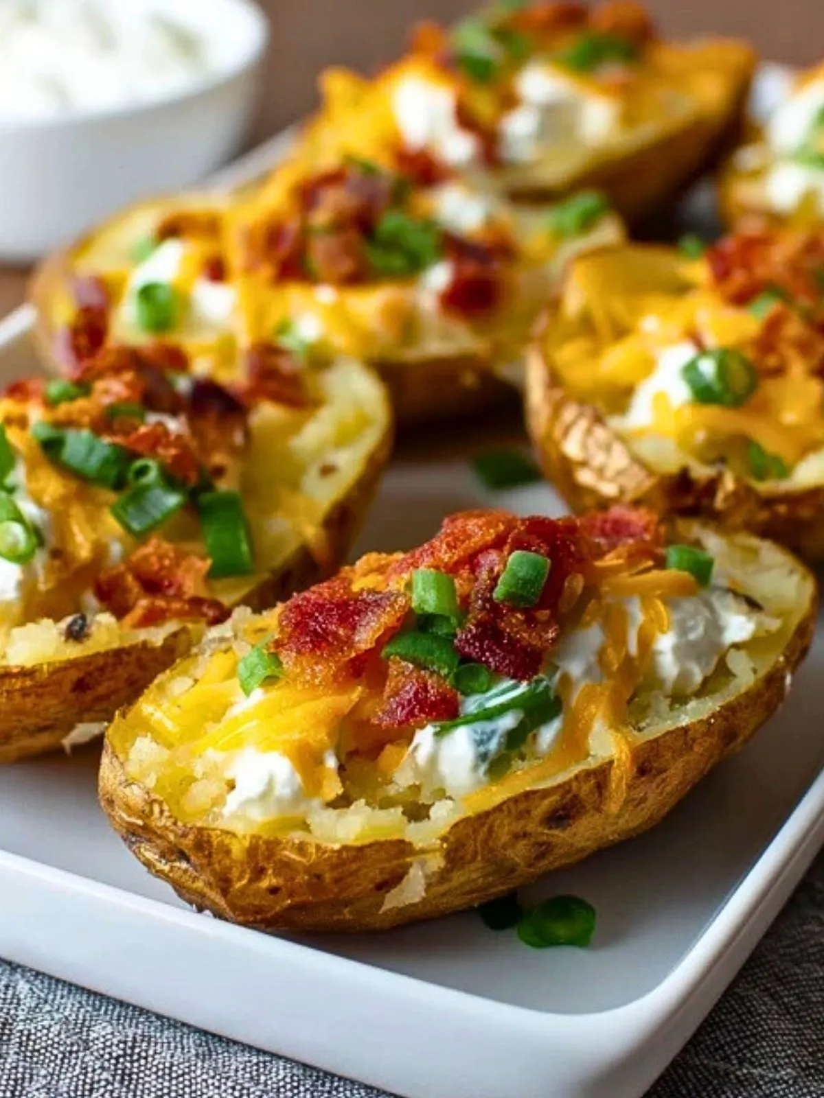 Ces peaux de pommes de terre farcies sont croustillantes à l’extérieur, ultra-fondantes à l’intérieur et généreusement garnies de crème fraîche, fromage gratiné et lardons fumés croustillants, pour une bouchée d’apéro ou une entrée ultra-gourmande à partager.