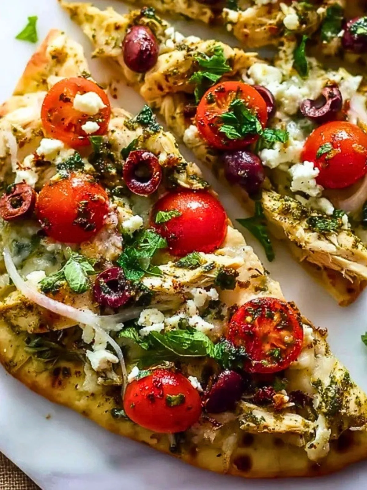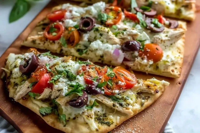 La pizza plateaux méditerranéenne au poulet est une pizza généreuse et ensoleillée qui associe une pâte croustillante, du poulet tendre, du pesto parfumé, des tomates cerises, des olives noires, de la feta et de la mozzarella fondante. Facile à partager, elle offre un repas convivial aux saveurs méditerranéennes, à la fois frais, gourmand et très simple à préparer.
