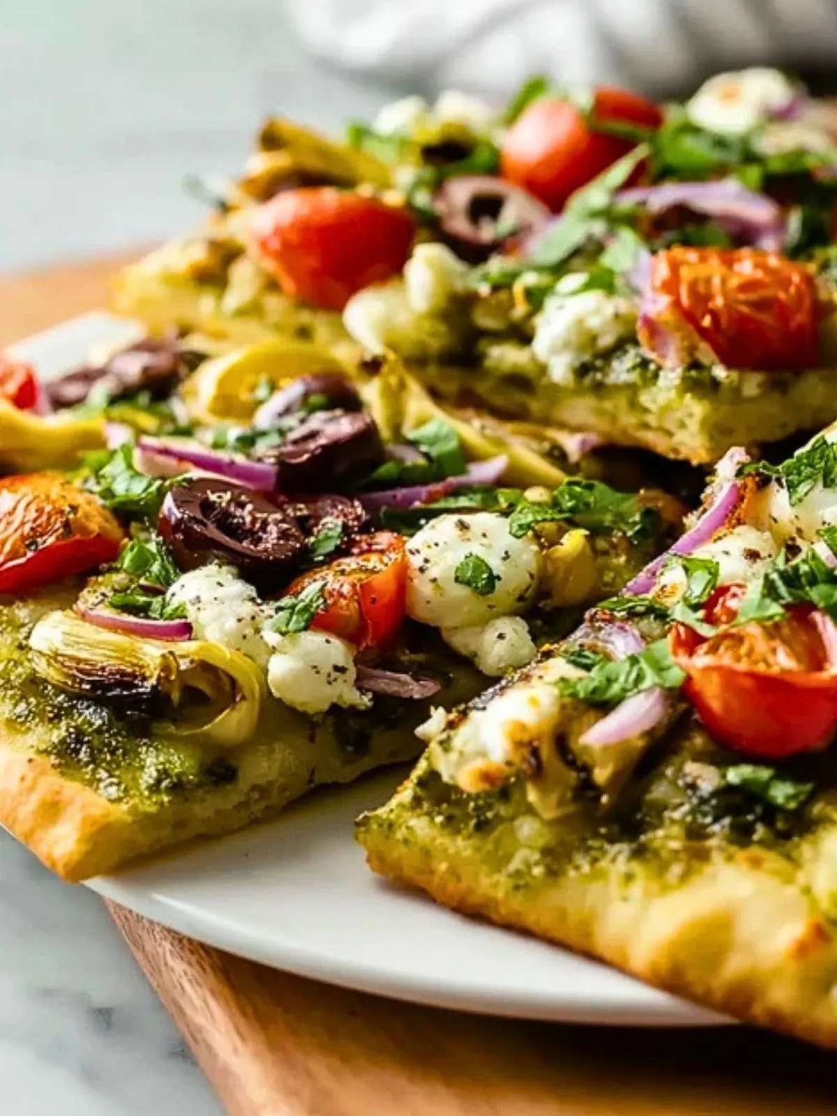 Chaque bouchée offre un bel équilibre entre l’intensité du pesto, la douceur des tomates rôties, le croquant léger de l’oignon rouge, la note saline des olives et la texture crémeuse du fromage. C’est une idée parfaite pour un dîner simple mais élégant, un déjeuner d’été ou un repas à partager lors d’un apéritif dînatoire entre amis.