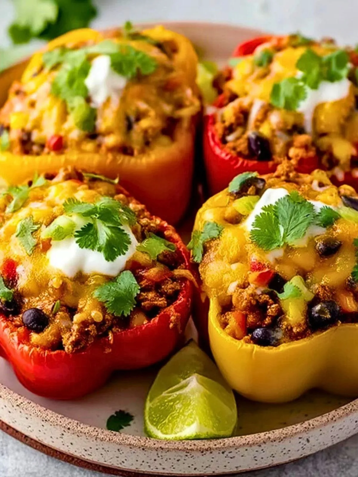 Ces poivrons farcis à la dinde mexicaine sont un plat coloré et sain : des demi-poivrons tendres garnis d’une farce à la dinde hachée, haricots noirs, maïs et riz parfumés aux épices tex-mex, puis gratinés au fromage fondant pour un dîner complet et plein de saveurs.