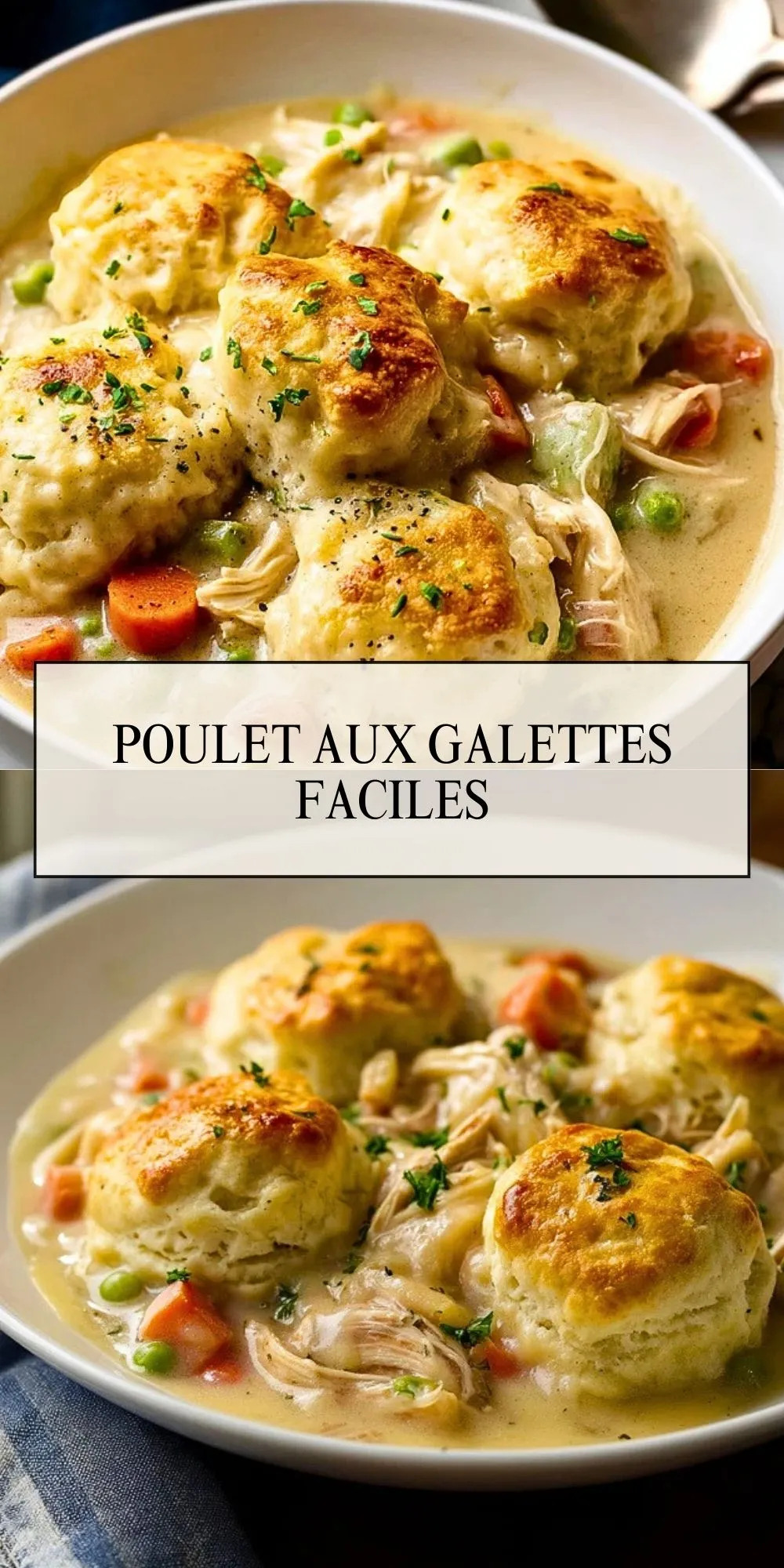 Poulet Aux Galettes Faciles est un plat complet et réconfortant composé de morceaux de poulet tendres, de légumes mijotés dans une sauce crémeuse et de galettes dorées cuites au four. Facile à préparer, généreux et convivial, il est parfait pour un dîner familial chaleureux.