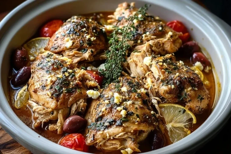 Un poulet mijoté à la méditerranéenne, aux herbes, au citron, aux olives et à la feta. Une viande fondante et parfumée, cuite lentement en cocotte pour un plat familial savoureux.