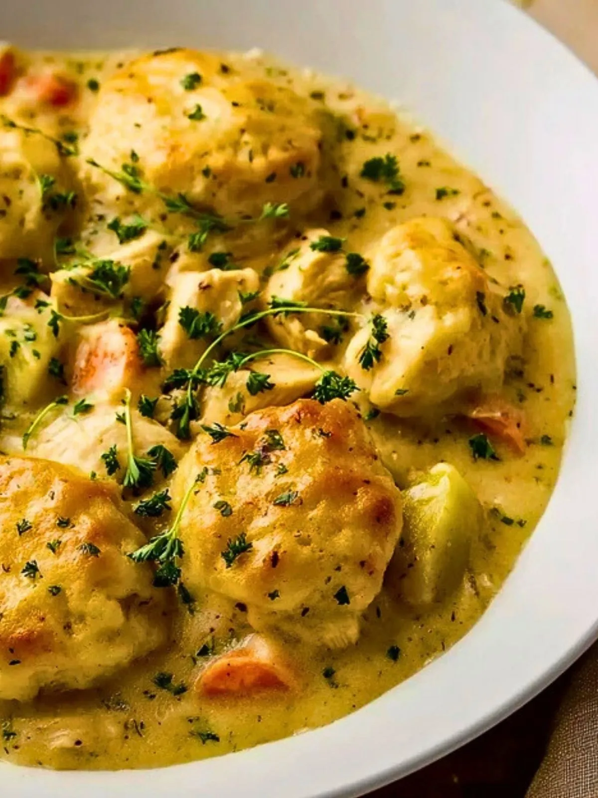 Cette version rappelle les grands classiques mijotés que l’on aime préparer quand on veut une assiette chaleureuse, facile à partager et pleine de saveurs douces. Les légumes fondent dans une sauce crémeuse, les morceaux de poulet restent juteux, et les petites boulettes de pâte deviennent légères tout en absorbant une partie du bouillon. C’est un plat convivial, rustique et absolument irrésistible.