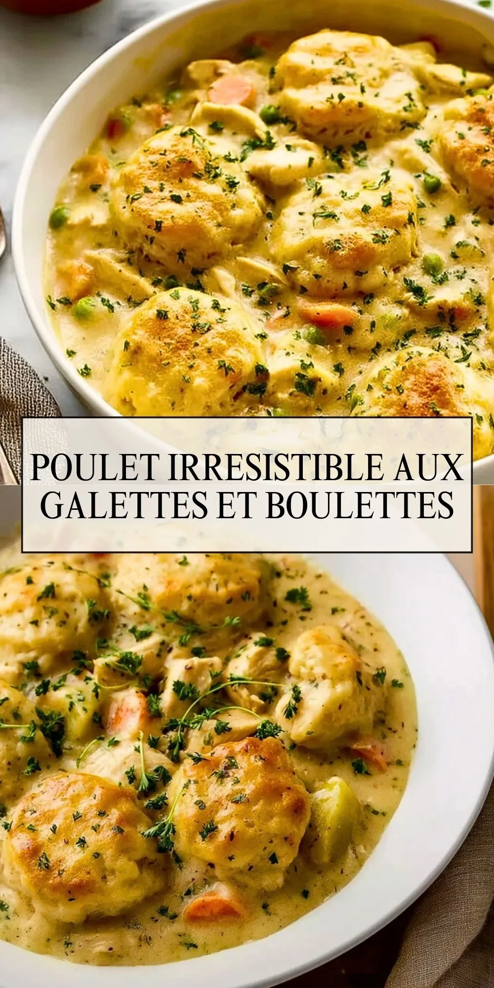 Keywords: poulet irrésistible aux galettes et boulettes, poulet crémeux, galettes moelleuses, plat réconfortant, poulet mijoté