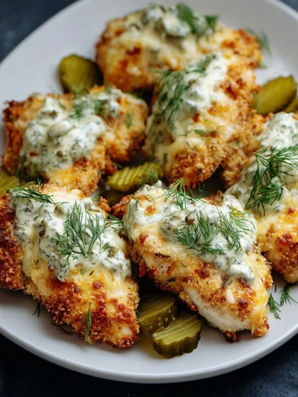 Un plat familial croustillant et original : de tendres filets de poulet enrobés d’une panure dorée au parmesan, gratinés au fromage et surmontés de cornichons à l’aneth. Parfait pour un dîner gourmand ou un brunch convivial !