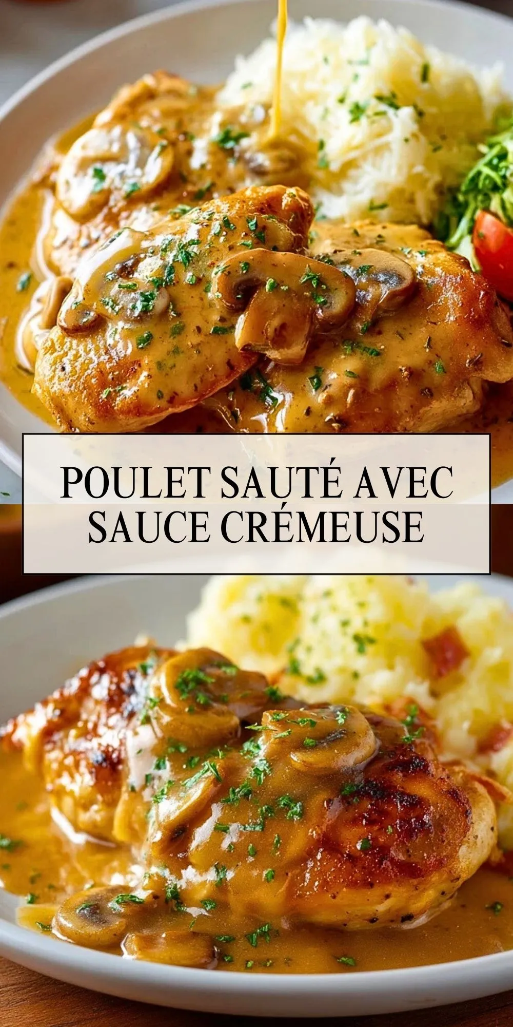 Ce poulet sauté avec sauce crémeuse est un plat savoureux et réconfortant, composé de blancs de poulet dorés et nappés d’une sauce onctueuse aux champignons et à l’ail. La crème apporte une texture veloutée tandis que le bouillon et les sucs de cuisson intensifient les saveurs. Facile et rapide à préparer, il constitue un repas complet et généreux, parfait pour un dîner en famille ou entre amis.