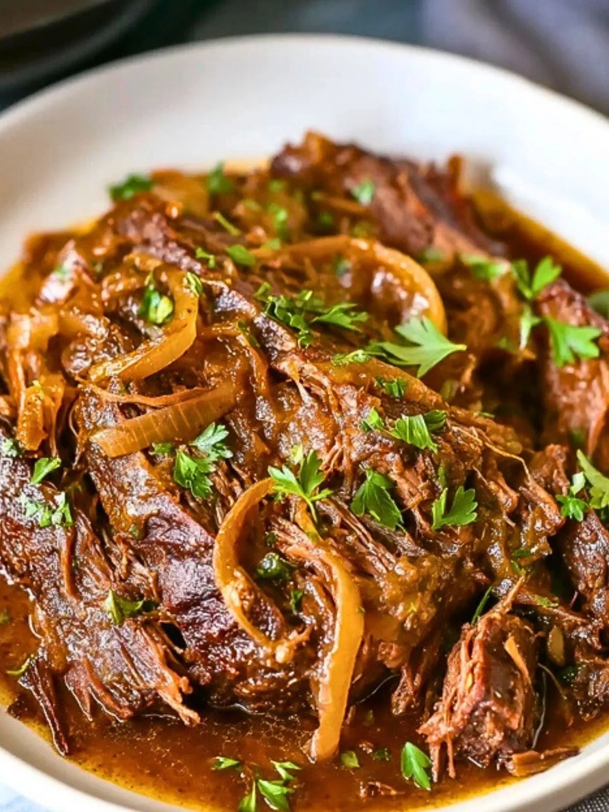 8. Tranchez ou effilochez le rôti, nappez-le d’oignons caramélisés et de sauce, puis parsemez de persil frais avant de servir.