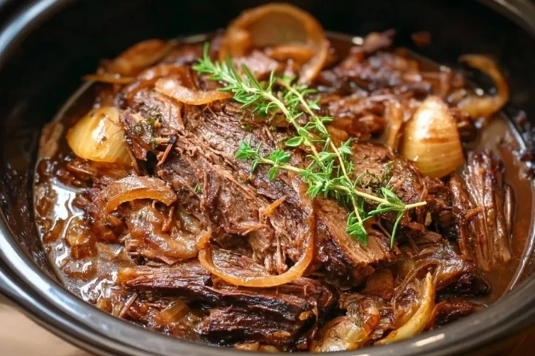 Ce plat séduit par son équilibre entre simplicité et intensité. Avec quelques ingrédients bien choisis, on obtient une sauce savoureuse, des oignons tendres presque confits et un bœuf qui s’effiloche facilement à la fourchette. Servi avec une purée maison, des pommes de terre rôties ou même des pâtes fraîches, il transforme un repas ordinaire en moment particulièrement chaleureux.