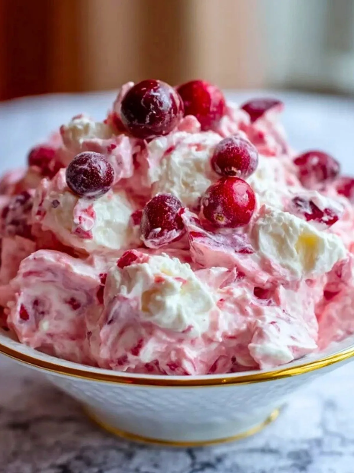 Salade de guimauve aux canneberges, ultra gourmande et festive, composée de canneberges acidulées légèrement macérées à l’orange, enrobées d’un mélange de crème fouettée et de yaourt vanillé, le tout parsemé de mini guimauves moelleuses pour un dessert mousseux, coloré et sans cuisson, parfait pour les fêtes d’hiver.