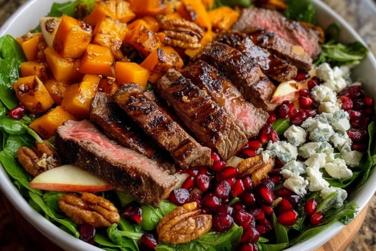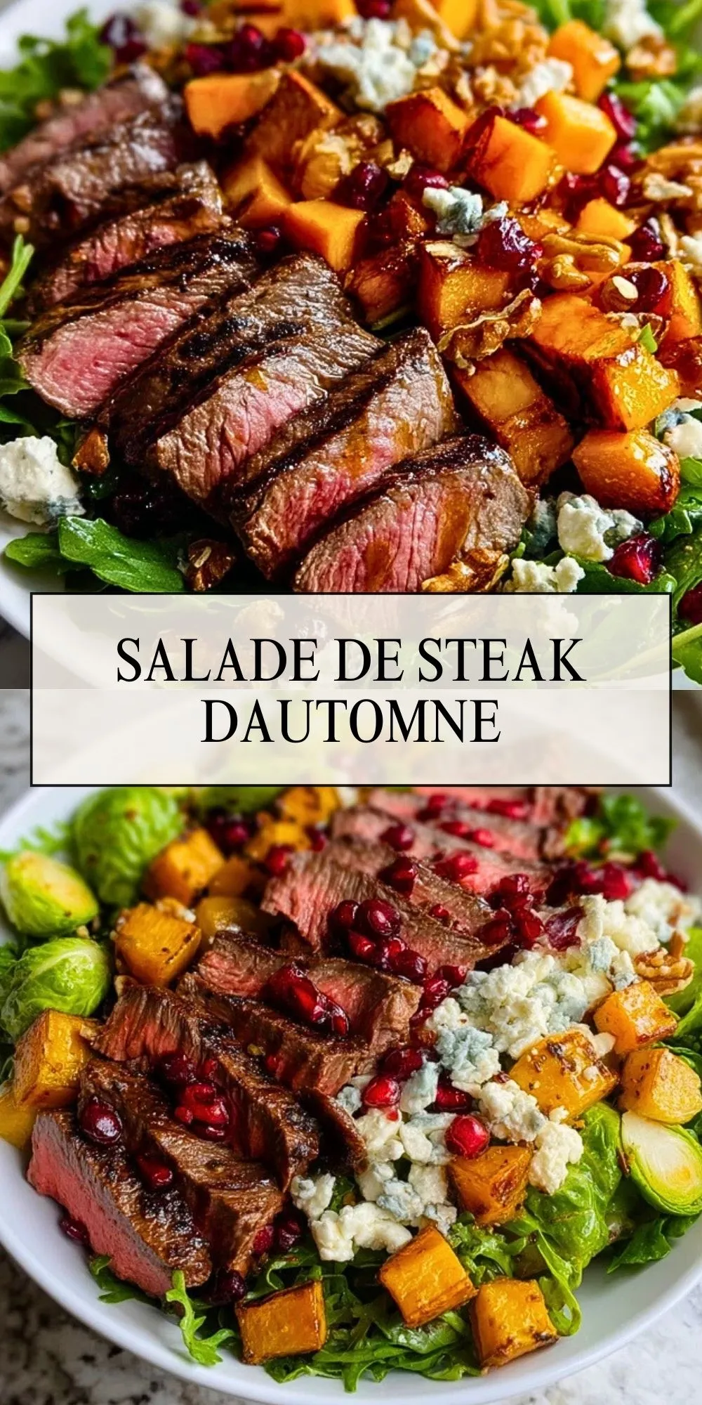 La salade de steak d’automne, riche en couleurs et en saveurs, marie le fondant de la courge rôtie, la tendreté du steak, le croquant des noix de pécan et l’acidulé de la grenade. Parfaite pour un déjeuner nourrissant ou un dîner raffiné, elle offre un vrai voyage gustatif au cœur de la saison. Sa vinaigrette au miel et balsamique relève délicatement l’ensemble pour un résultat équilibré et gourmand.